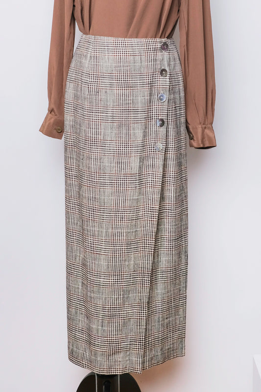 Plaid Brown Linen Blend Midi Skirt US 8, 80's Karen Kane