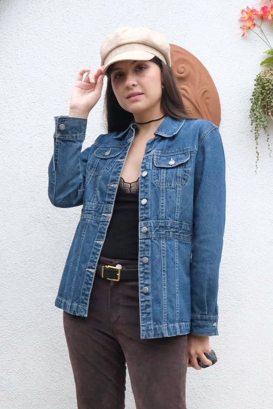 Havana Jacks Denim Jacket US 4/6, 90's Longline Fitted Waistline Medium Blue Wash