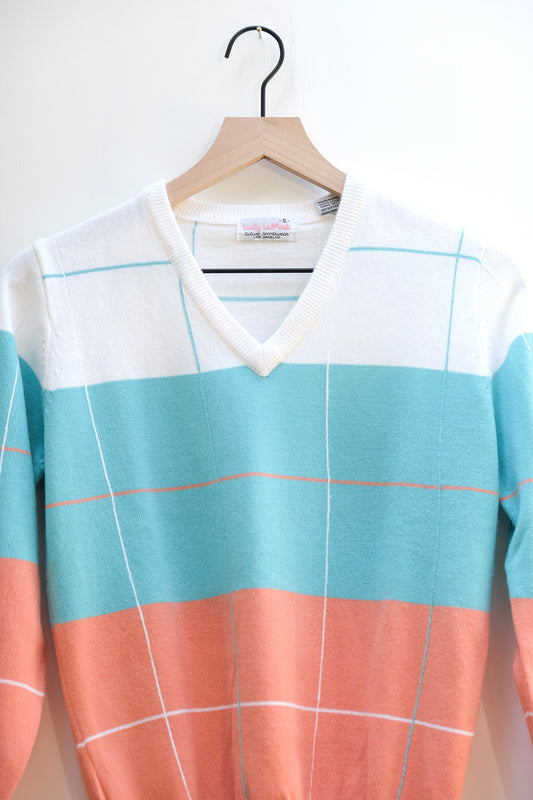 70’s Tennis Cardigan Baby Blue Ivory Colorblock US 6, Knit Boutique for Sears