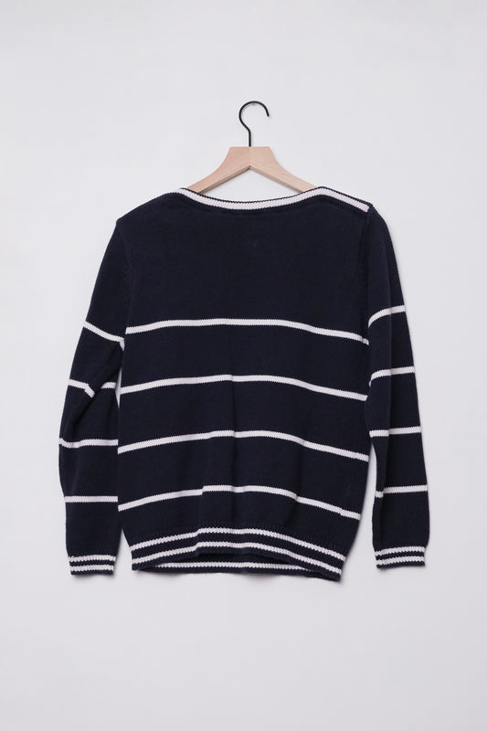90s Navy Blue Sailor Stripe Boatneck Knit Sweater, US Size 6, Nautical Coastal