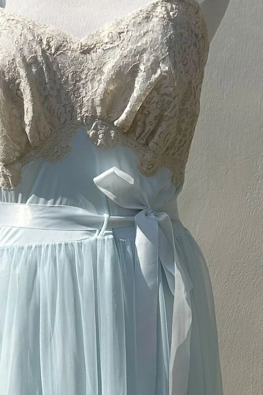 Baby Blue Sheer A-Line 60's Nightgown Lace Trim Dress, US 8 M/L