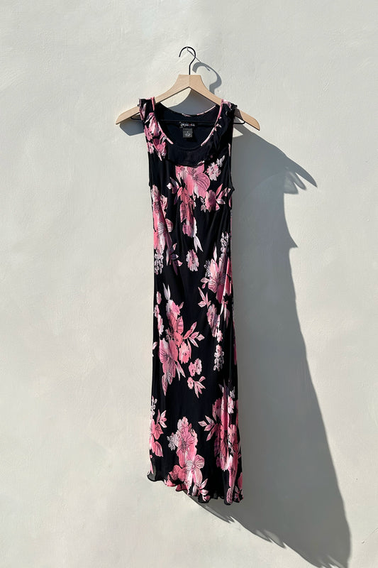 Black Pink Floral Ruffle Midi Dress, US Size 8, Vintage 2000s Fitted Style & Co Y2K