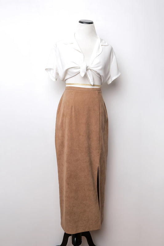 Faux Suede Tan High Waisted Midi Skirt US 8 M/L Y2K First Option Lightweight