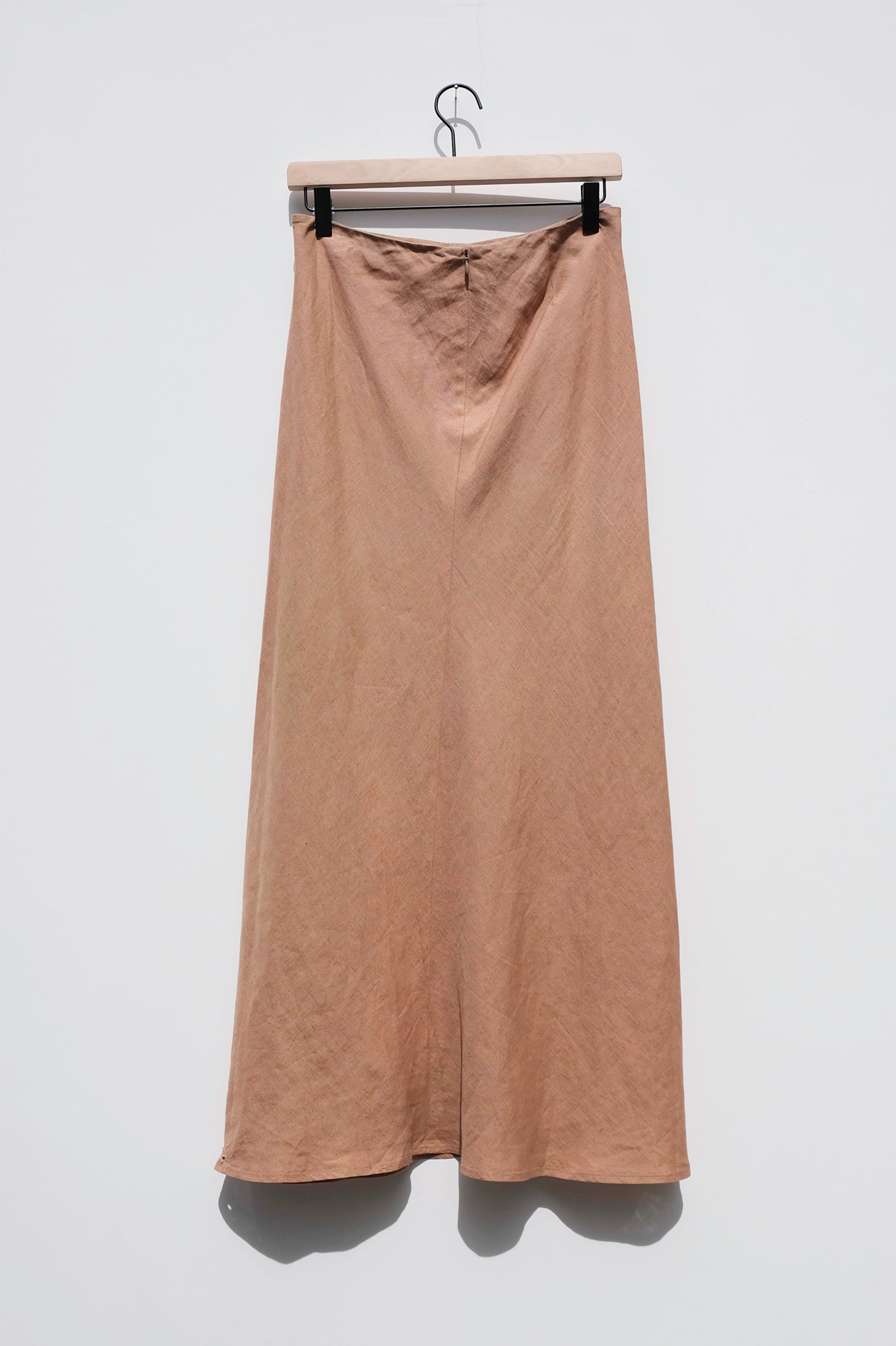 *Final sale* Lightweight linen midi skirt in a beautiful camel/khaki color. Hidden side zip closure. Small holes by the hem. Great summer to fall transition piece. Fits a size 4.