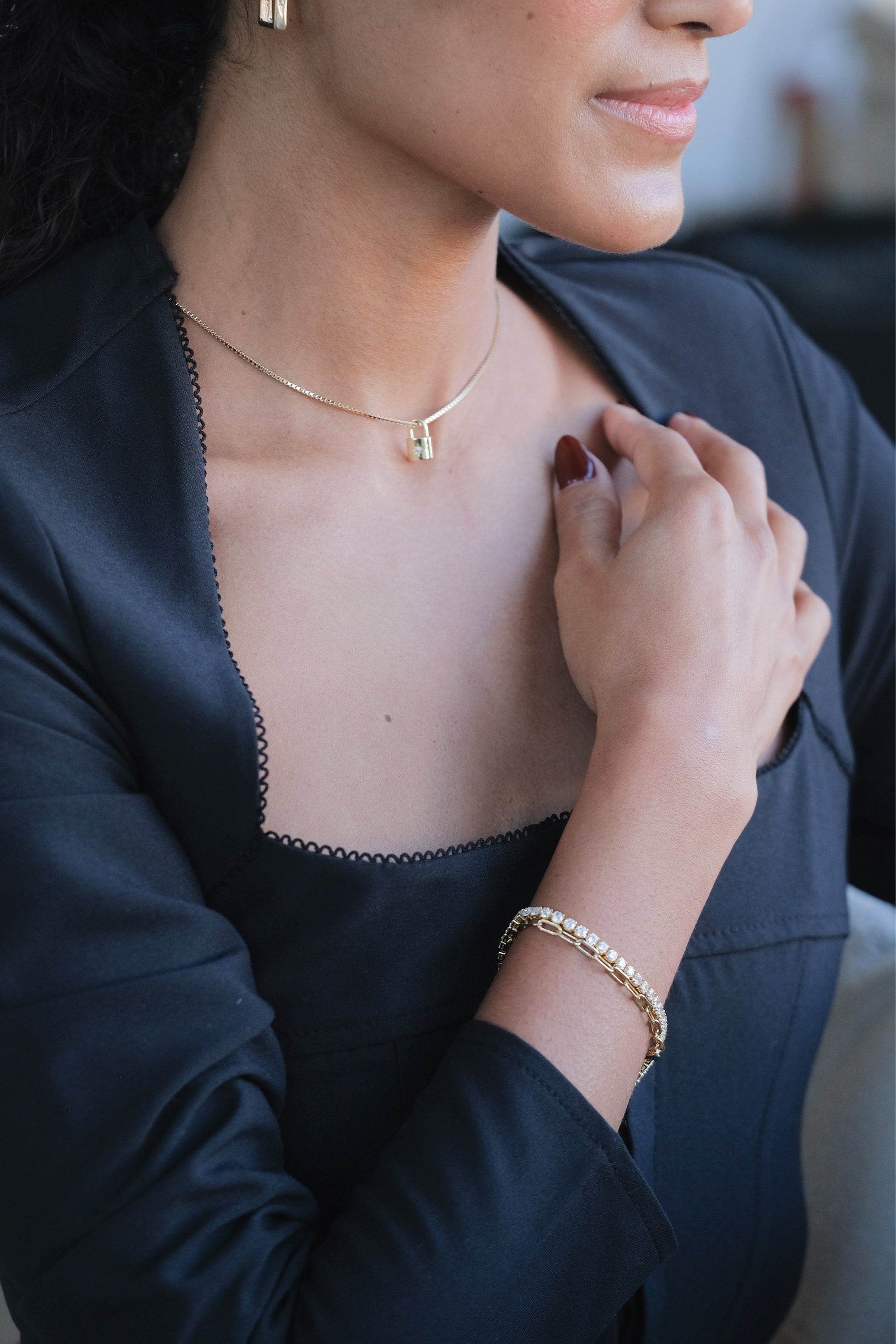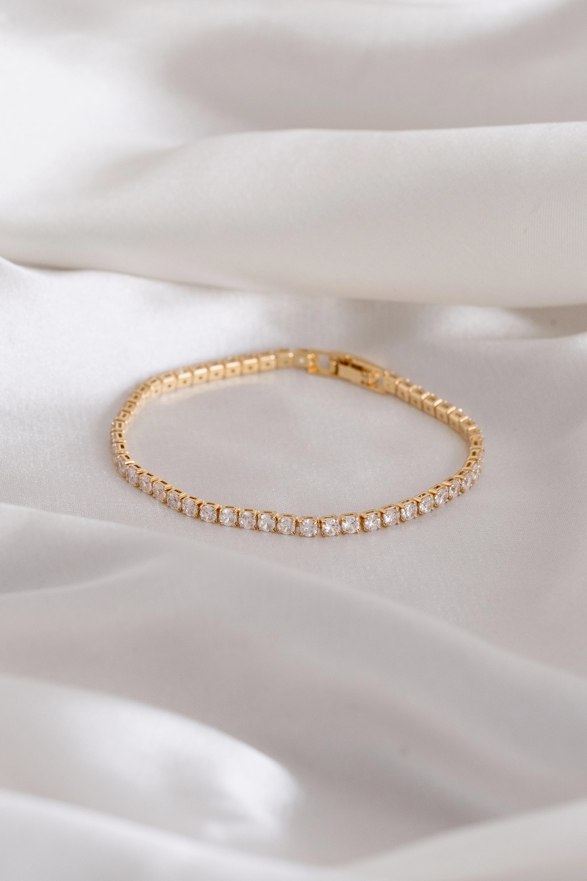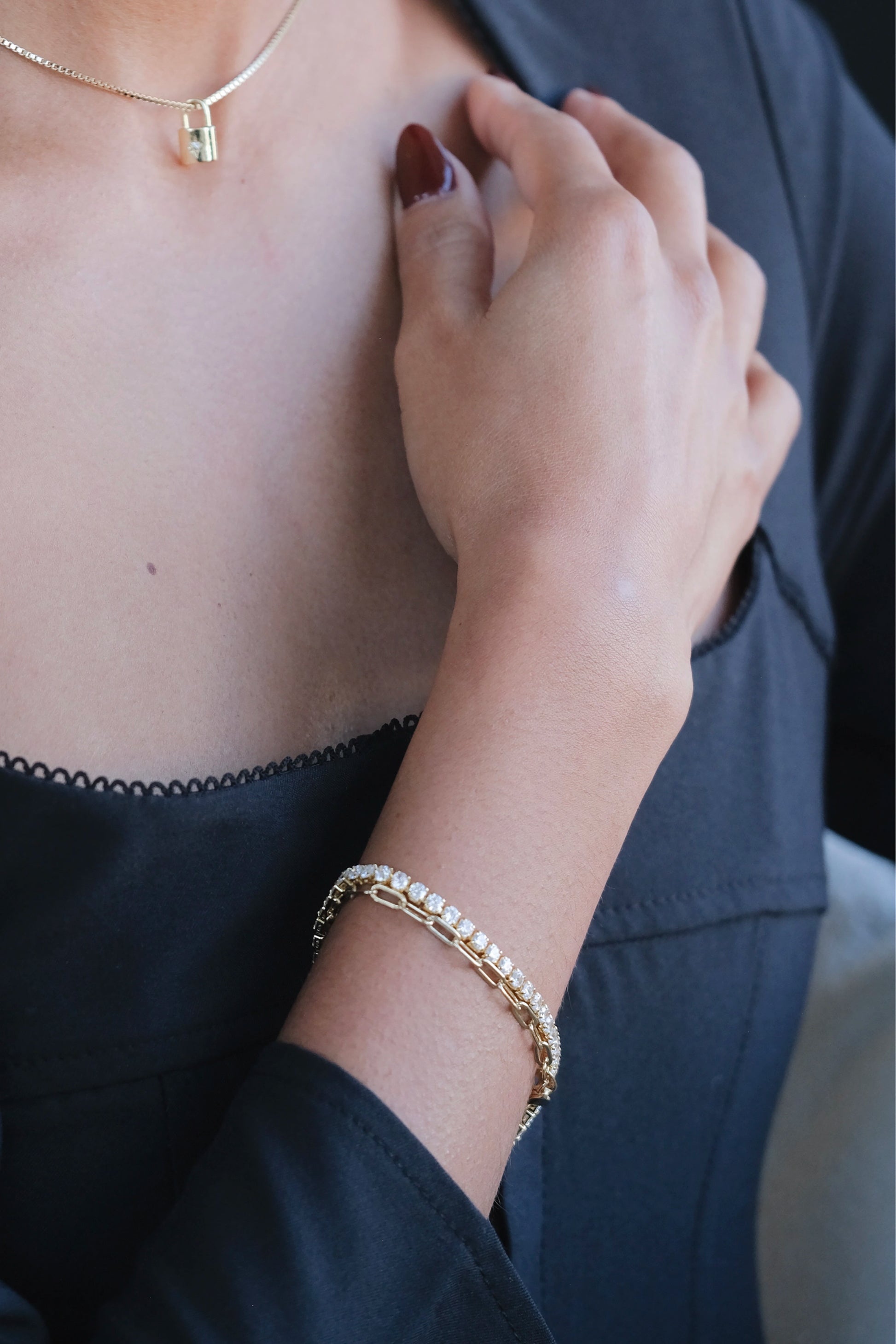 This 14k gold-filled crystal tennis bracelet adds a touch of sparkle to any outfit. Layer with the Paperclip Chain Bracelet for a simple but elevated look. Features a secure snap latch closure.
