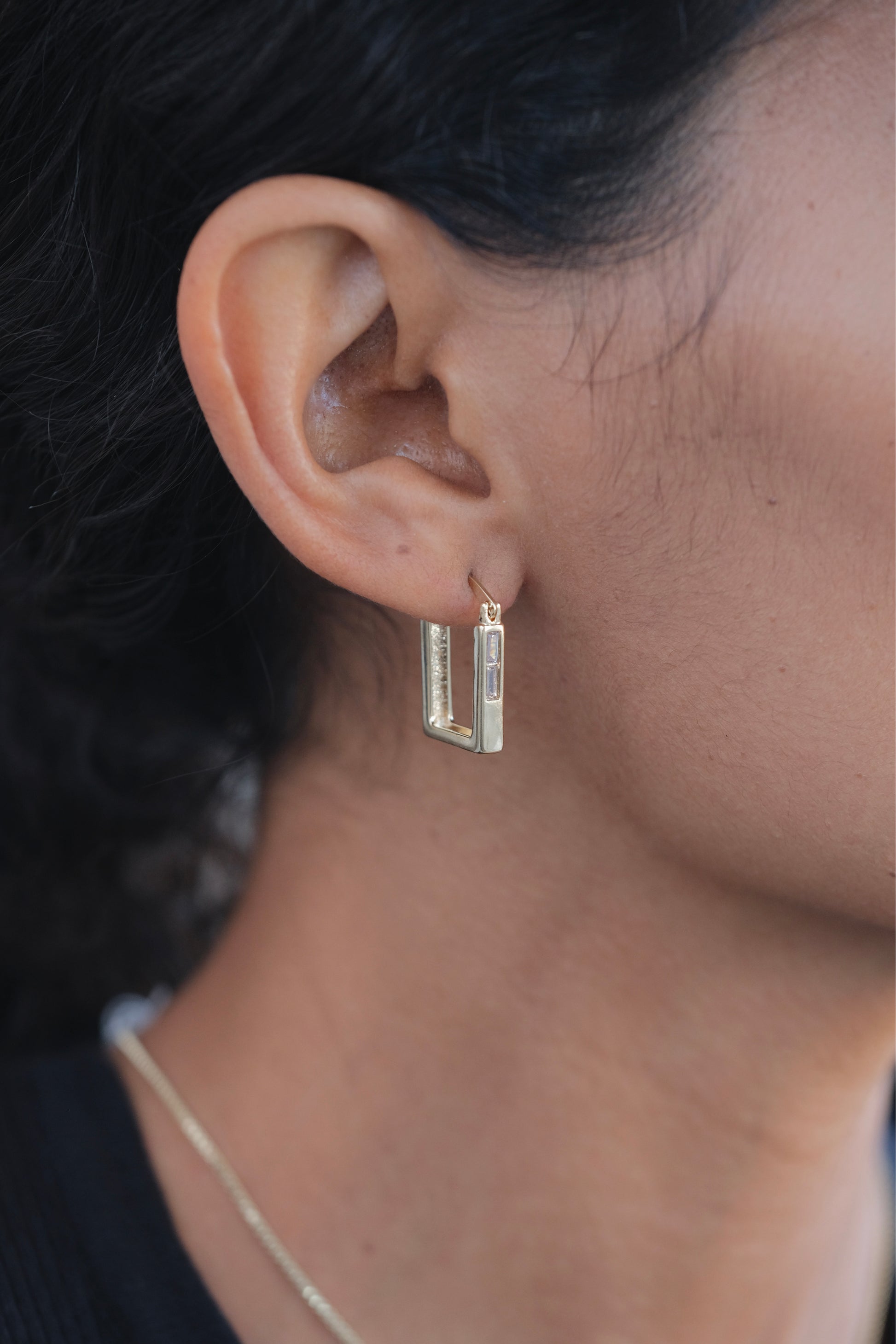These gorgeous square hoop earrings feature premium AAAAA baguette cubic zirconia on the front. Easy to wear latch closure.