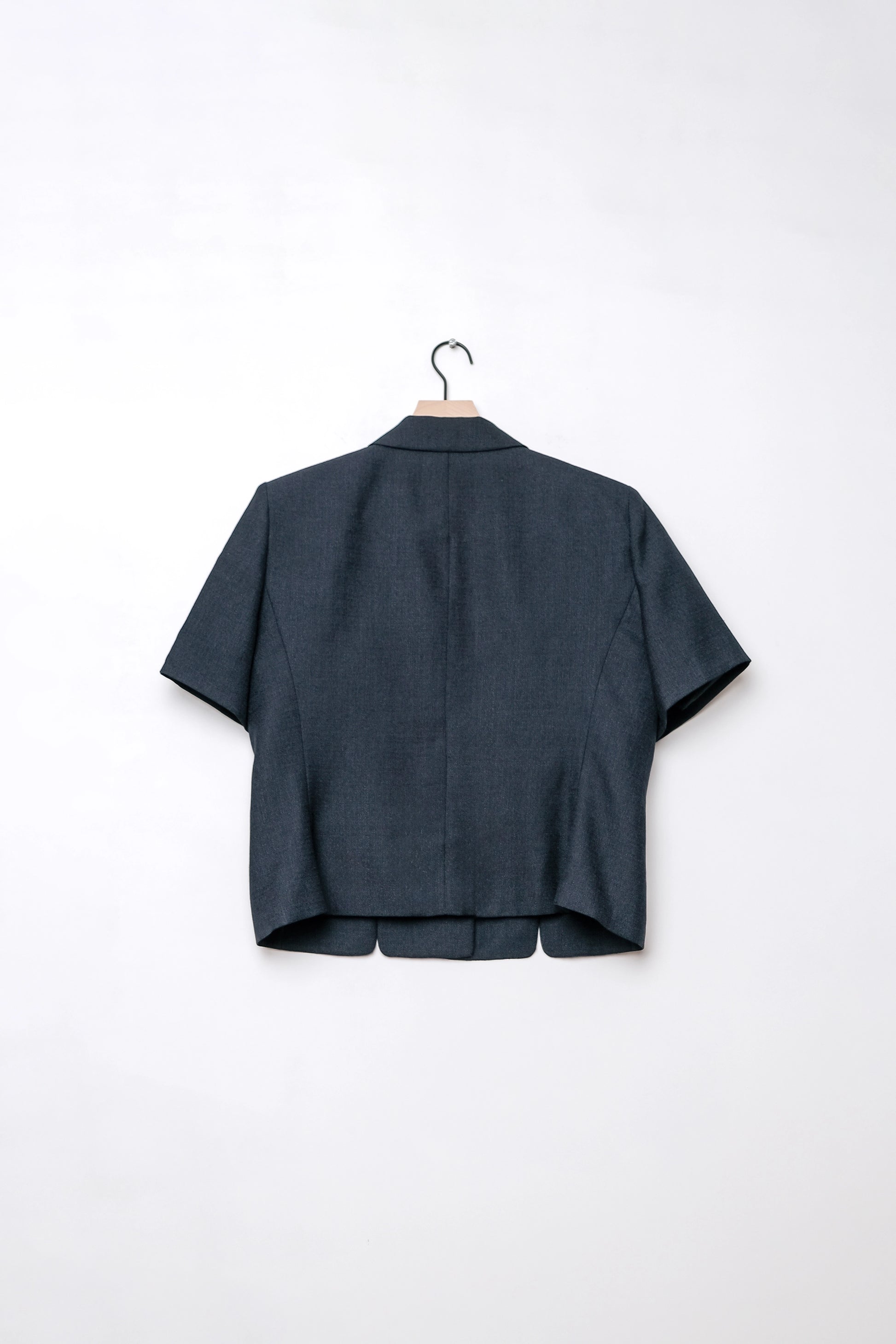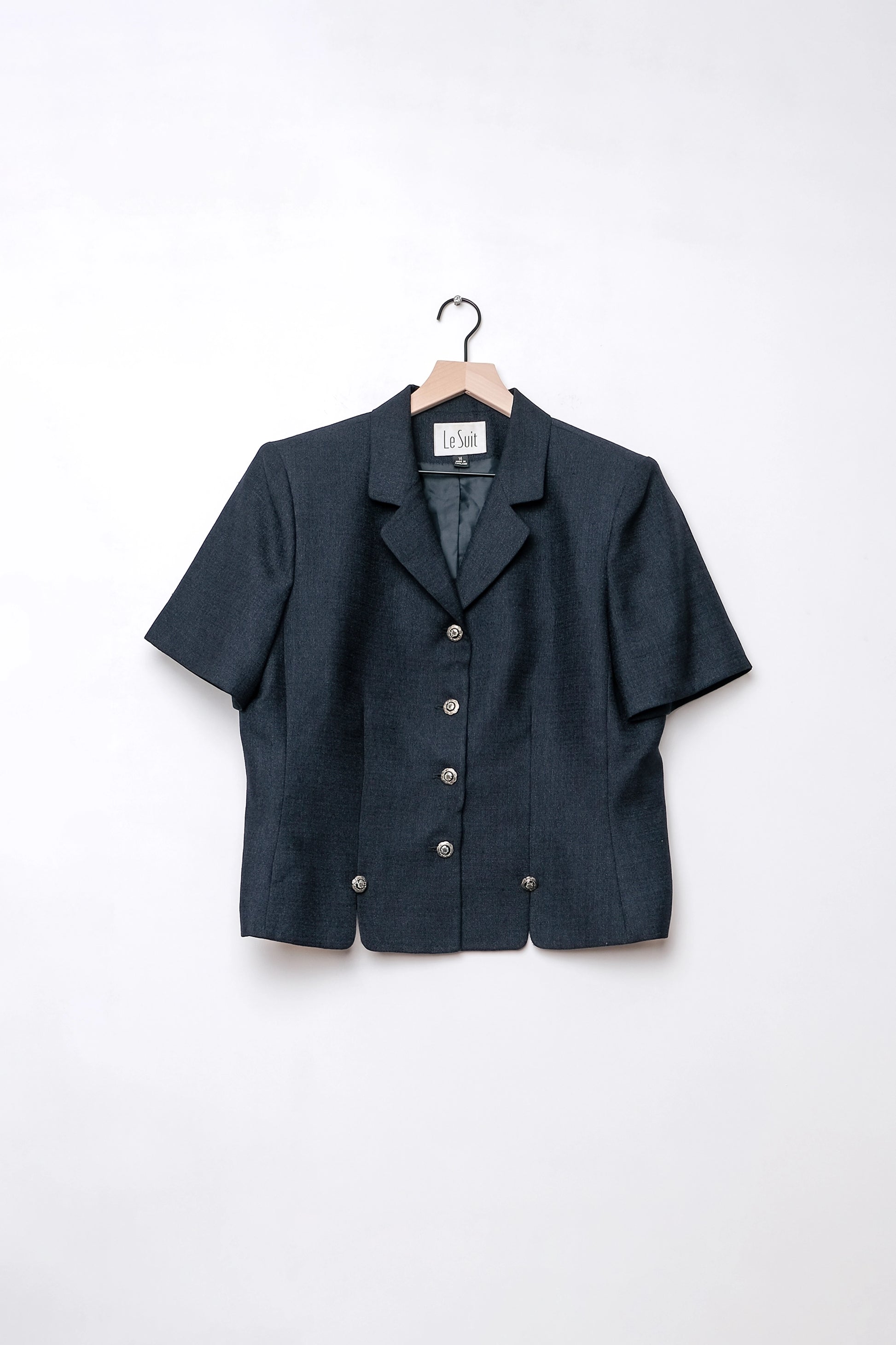 Short sleeve navy blue suit jacket with unique victorian style floral buttons. Front vents at the hem. Padded shoulders. Can be worn as a top and dressed down with light denim jeans. Or dress it up for work with brown or khaki trousers.