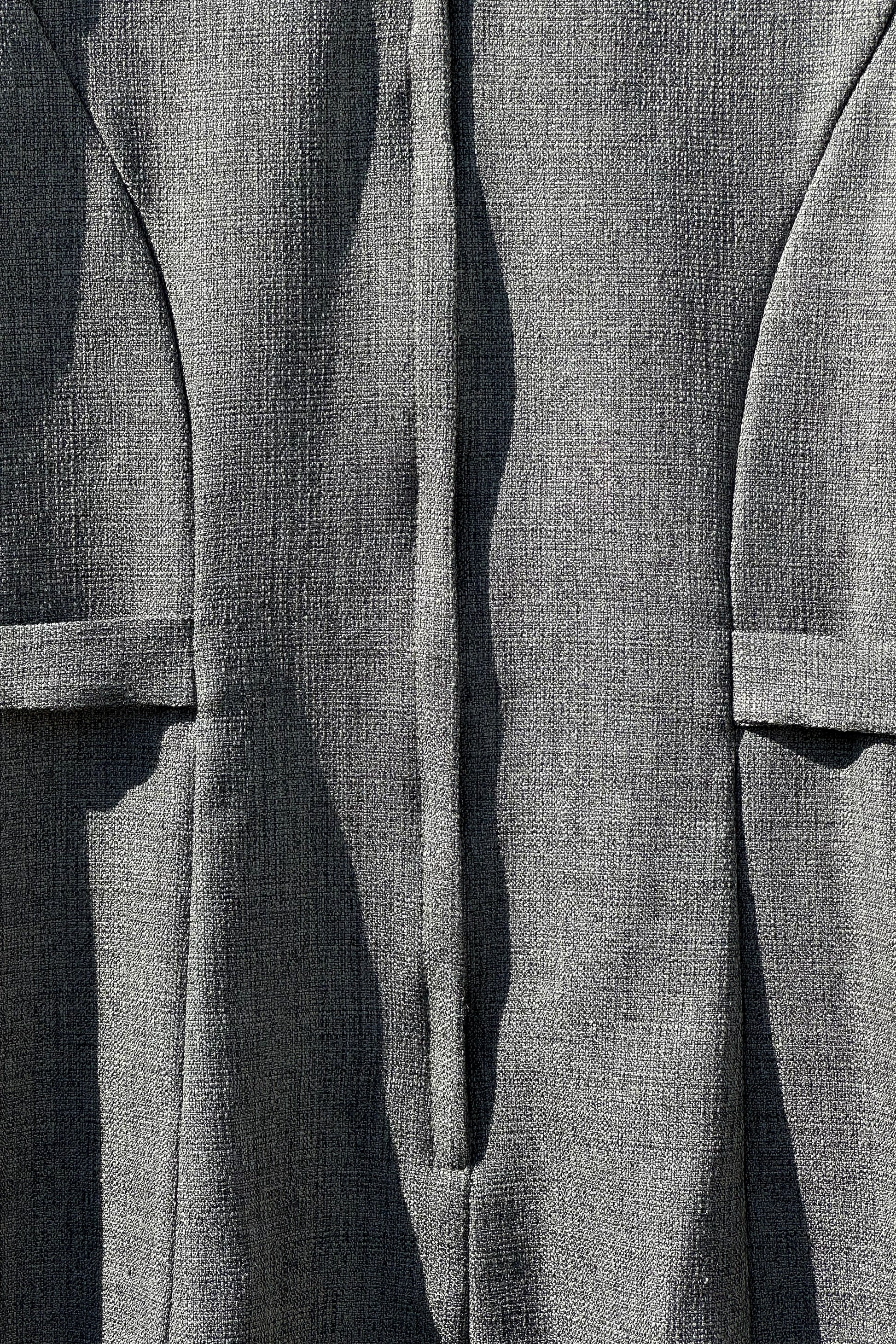 Tweed sleeveless dress with pleating at the skirt. Back zip closure. Softer synthetic blend fabric with a tiny bit of stretch. Styled with a white blouse, not included.