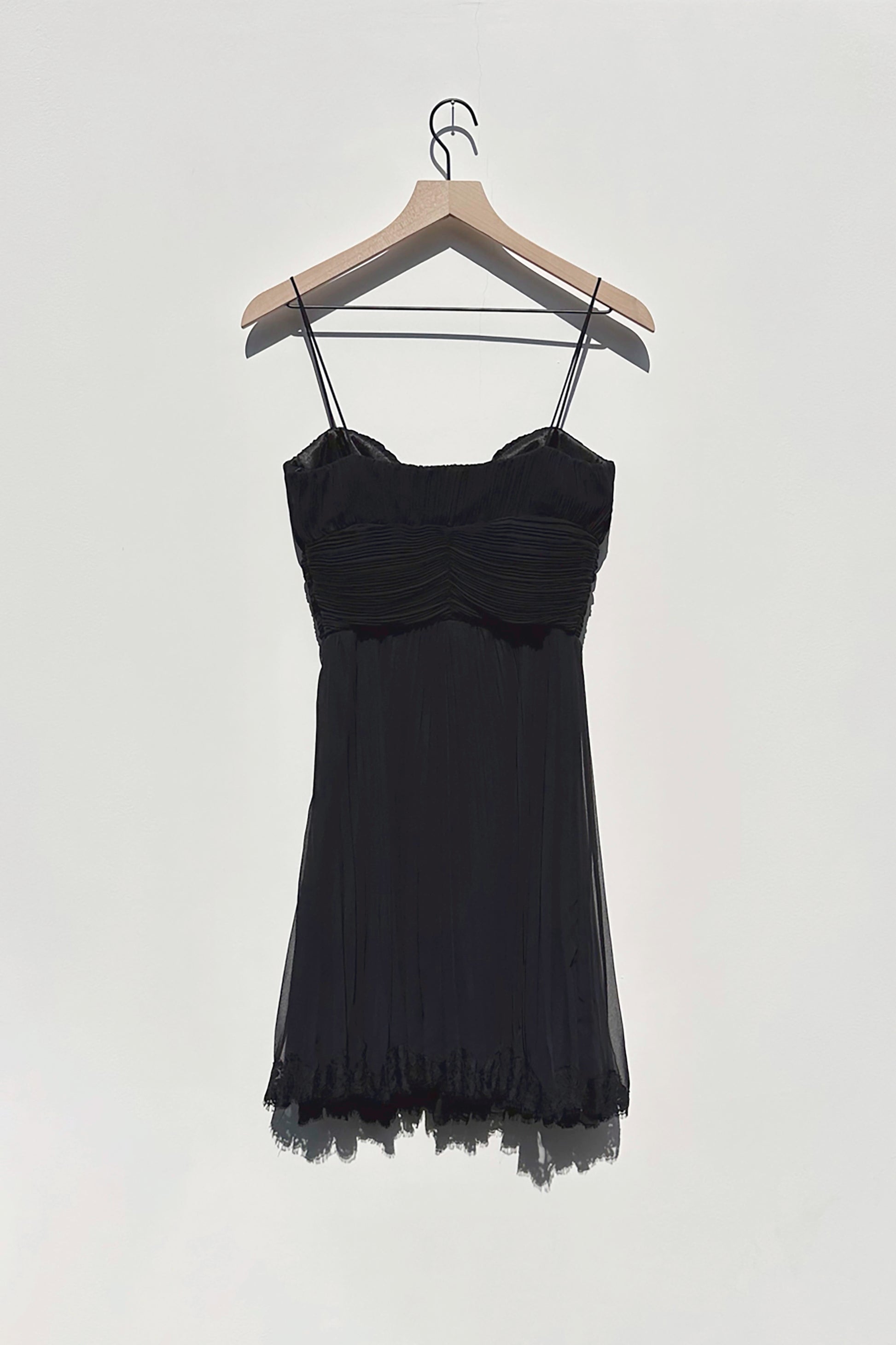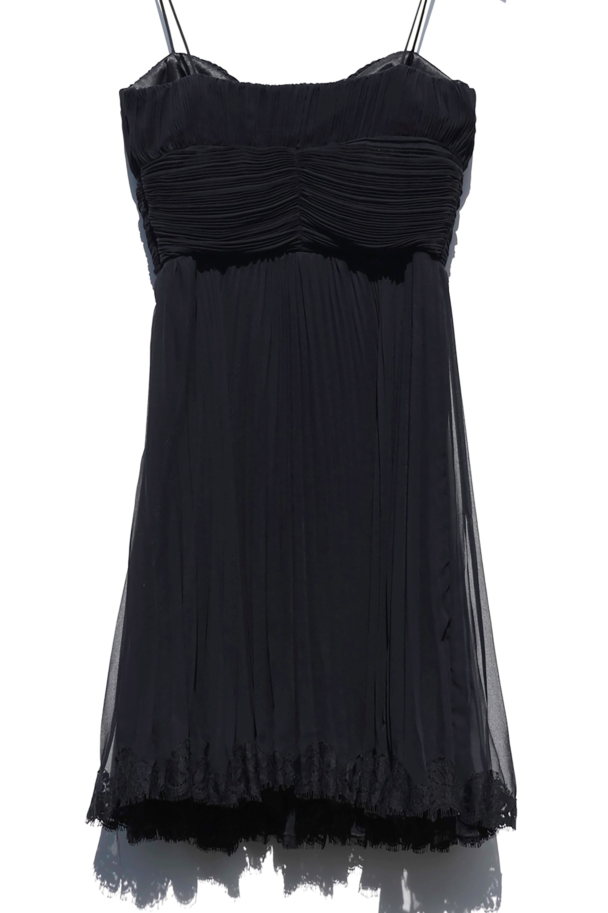 Beautiful black pleated dress with a sweetheart necklace and thin spaghetti straps. Zip closure. Lace trim detail, above the knee length.