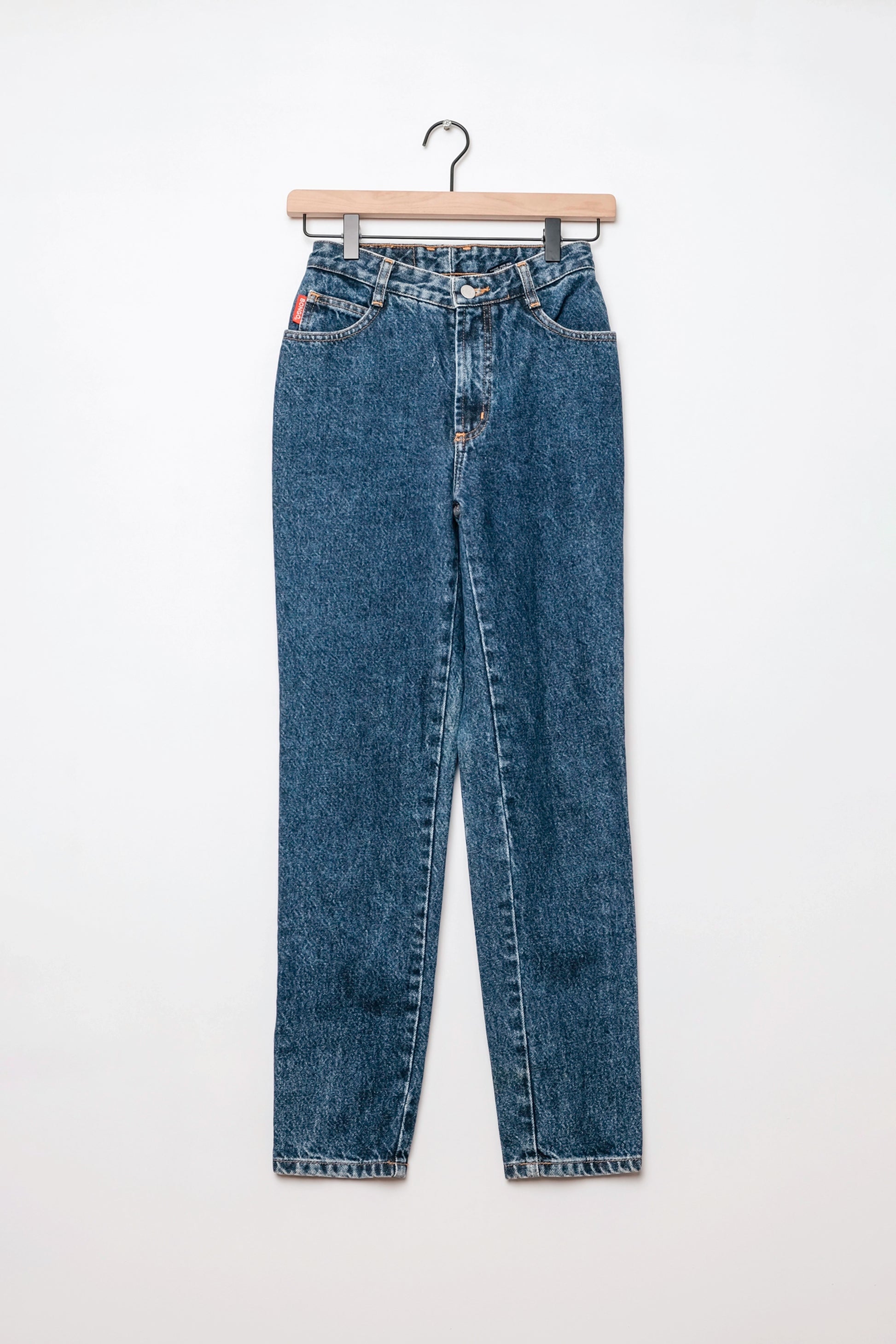 High waisted medium blue wash 90's jeans. Straight leg with slight tapered ankle.