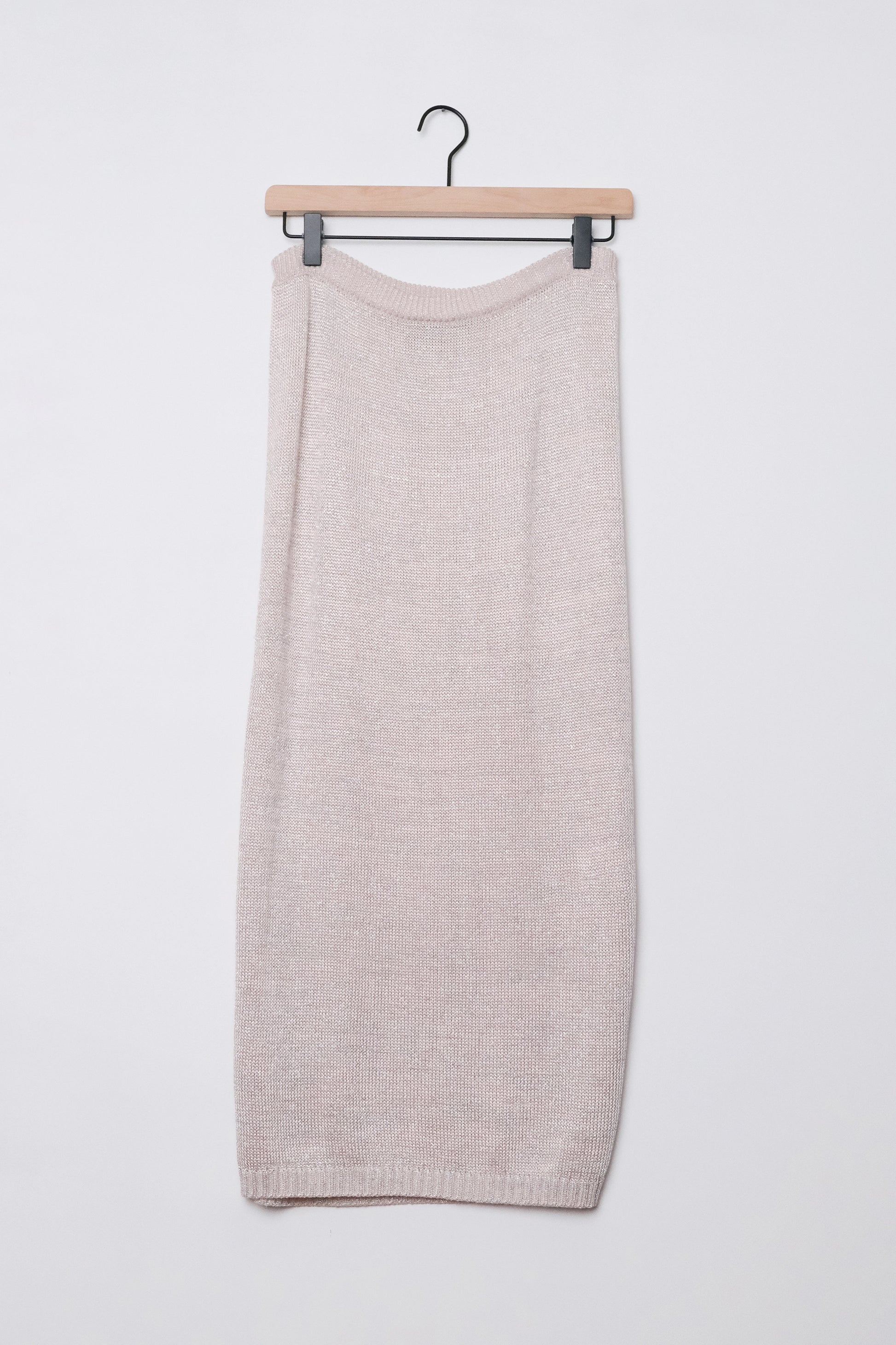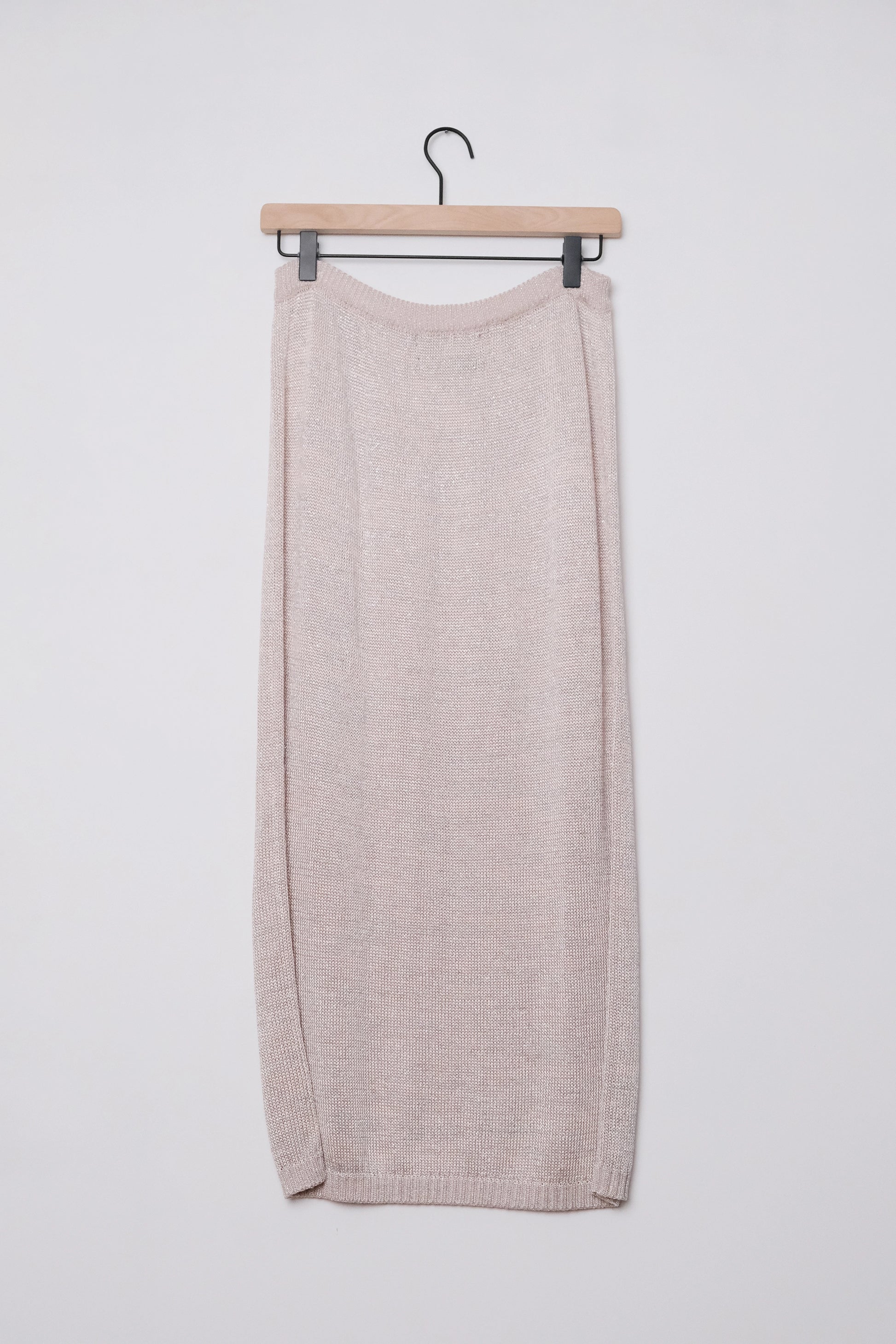 Amazing pink knit midi skirt. Metallic silver threads make this skirt sparkle! Dress it up with an oversized sweater and ballet flats or tuck in a vintage t-shirt with sneakers for a casual vibe. This item stretches. Throw it on over a bikini for chillier beach days.