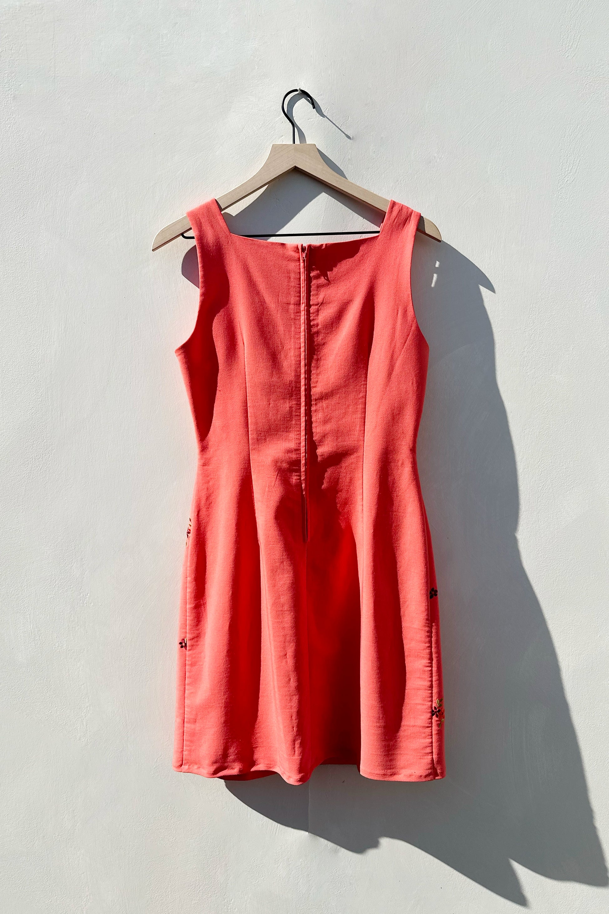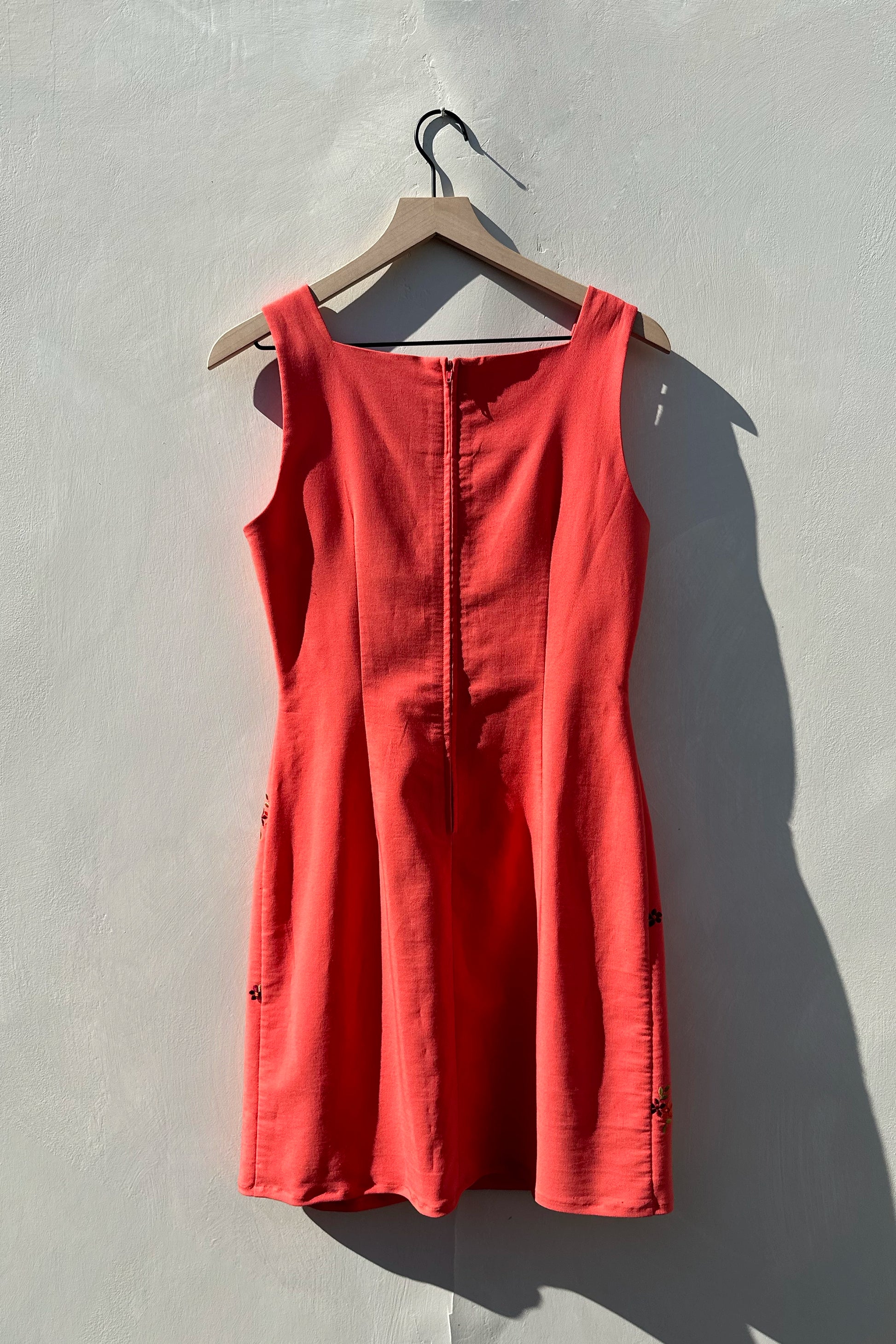 Square neck bright poppy red dress with embroidered flowers. Back zip closure.