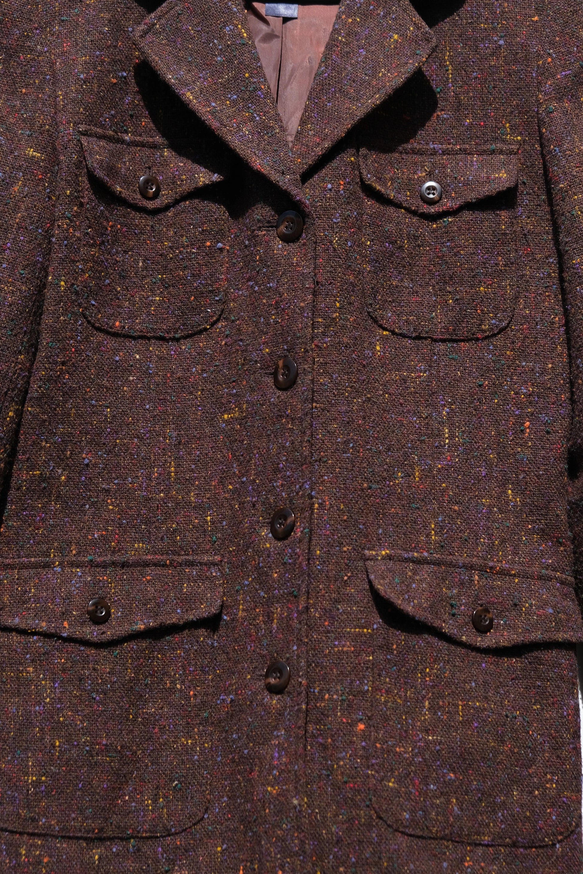 Tailored brown wool-blend jacket with colorful speckled detail. Four front pockets. Fits a size 4-6.