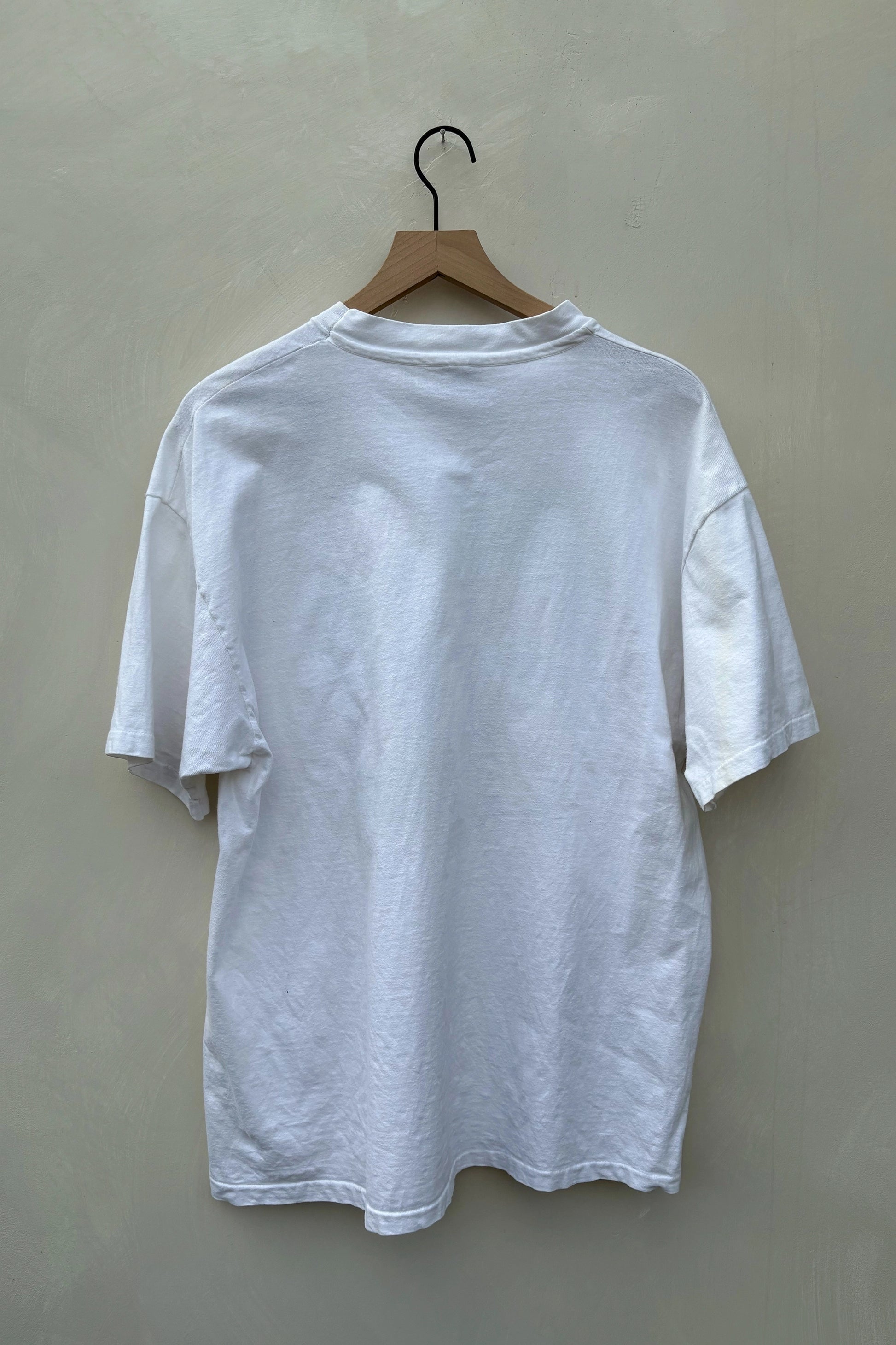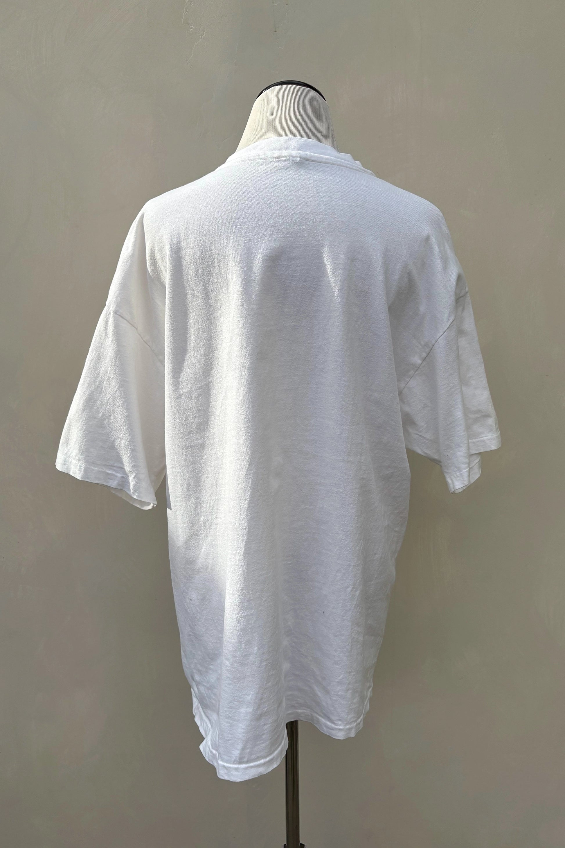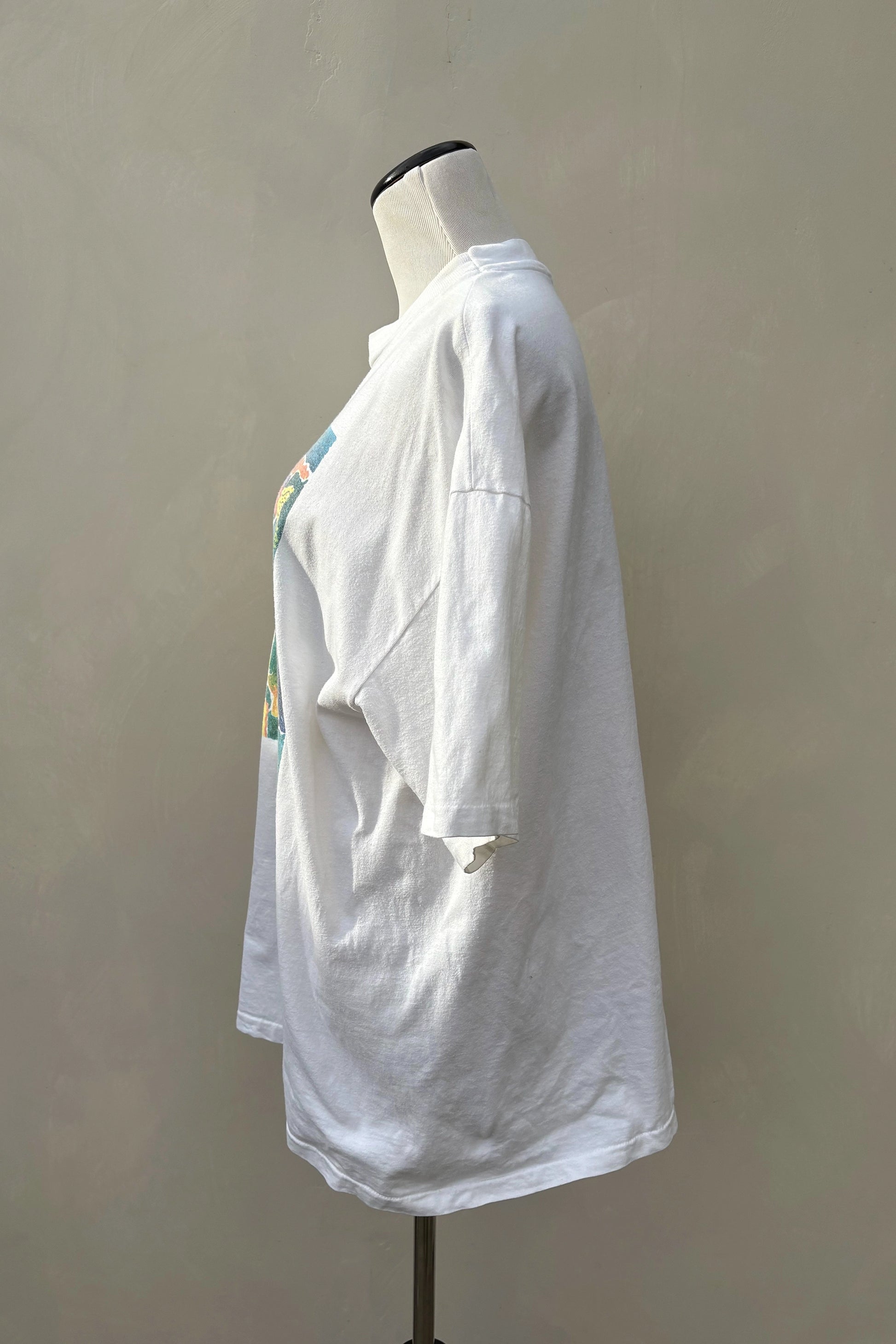 Boxy thick white cotton t-shirt with a faded watercolor painting graphic by artist Katharine Montstream. Slightly broken in and soft from age.