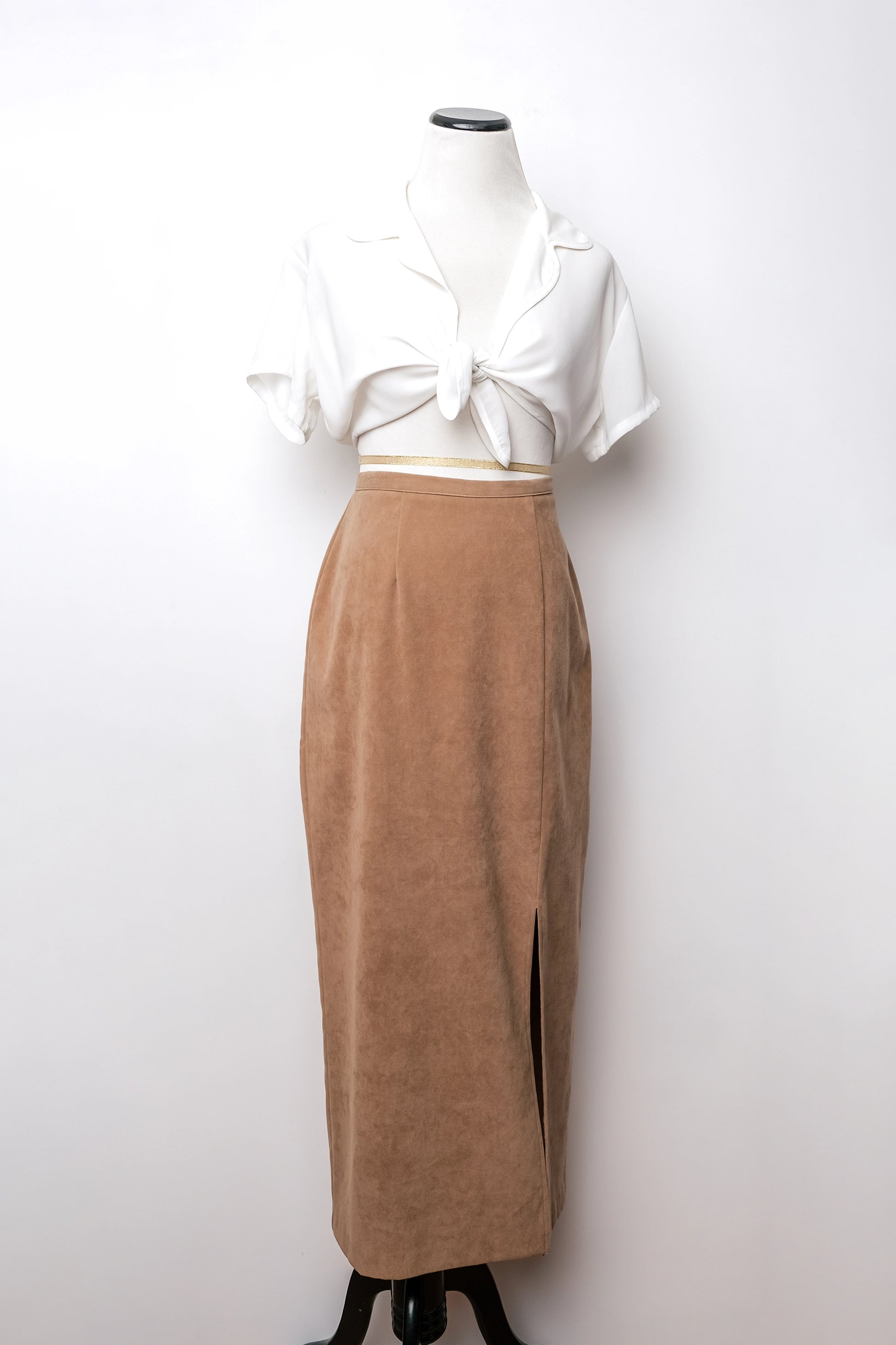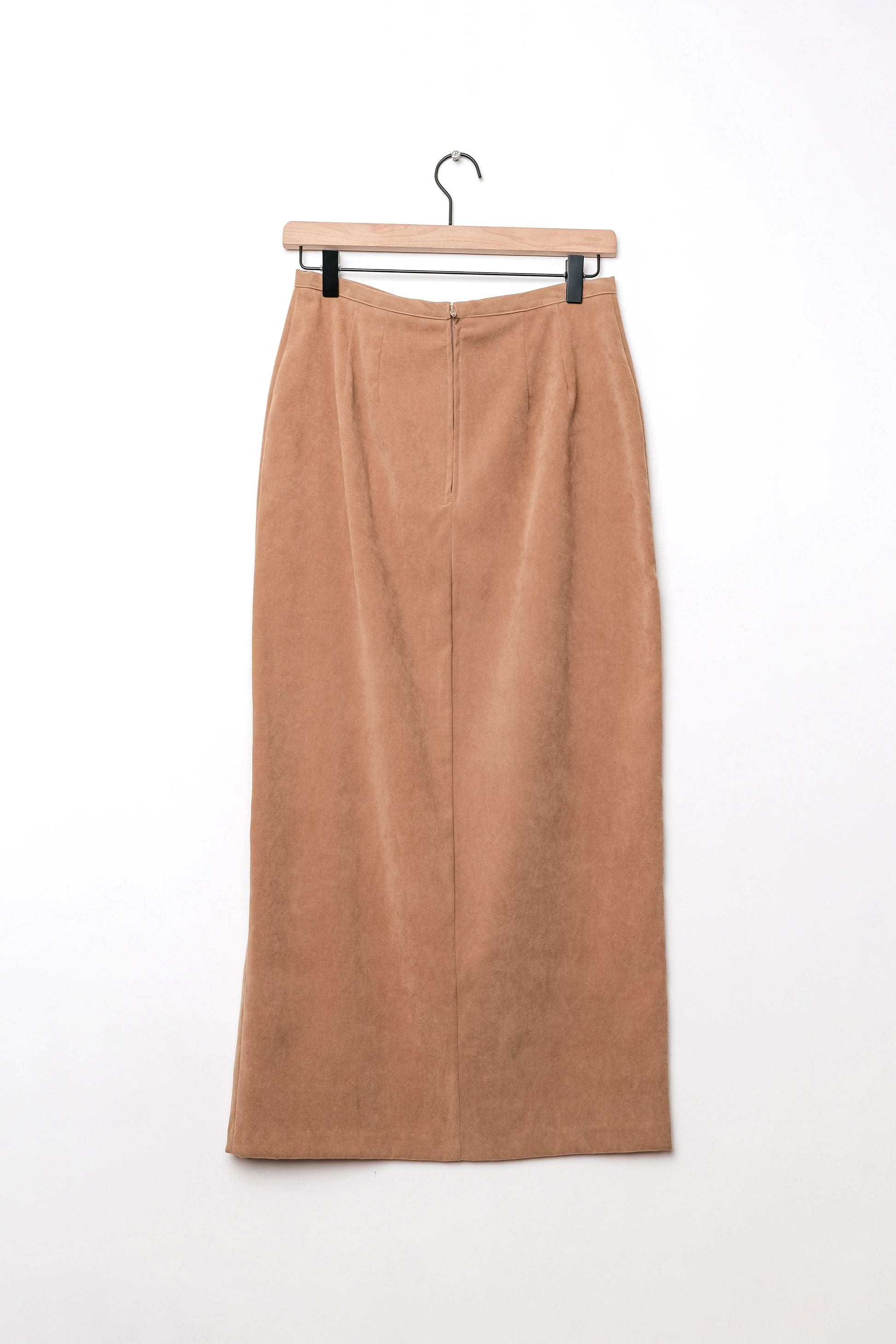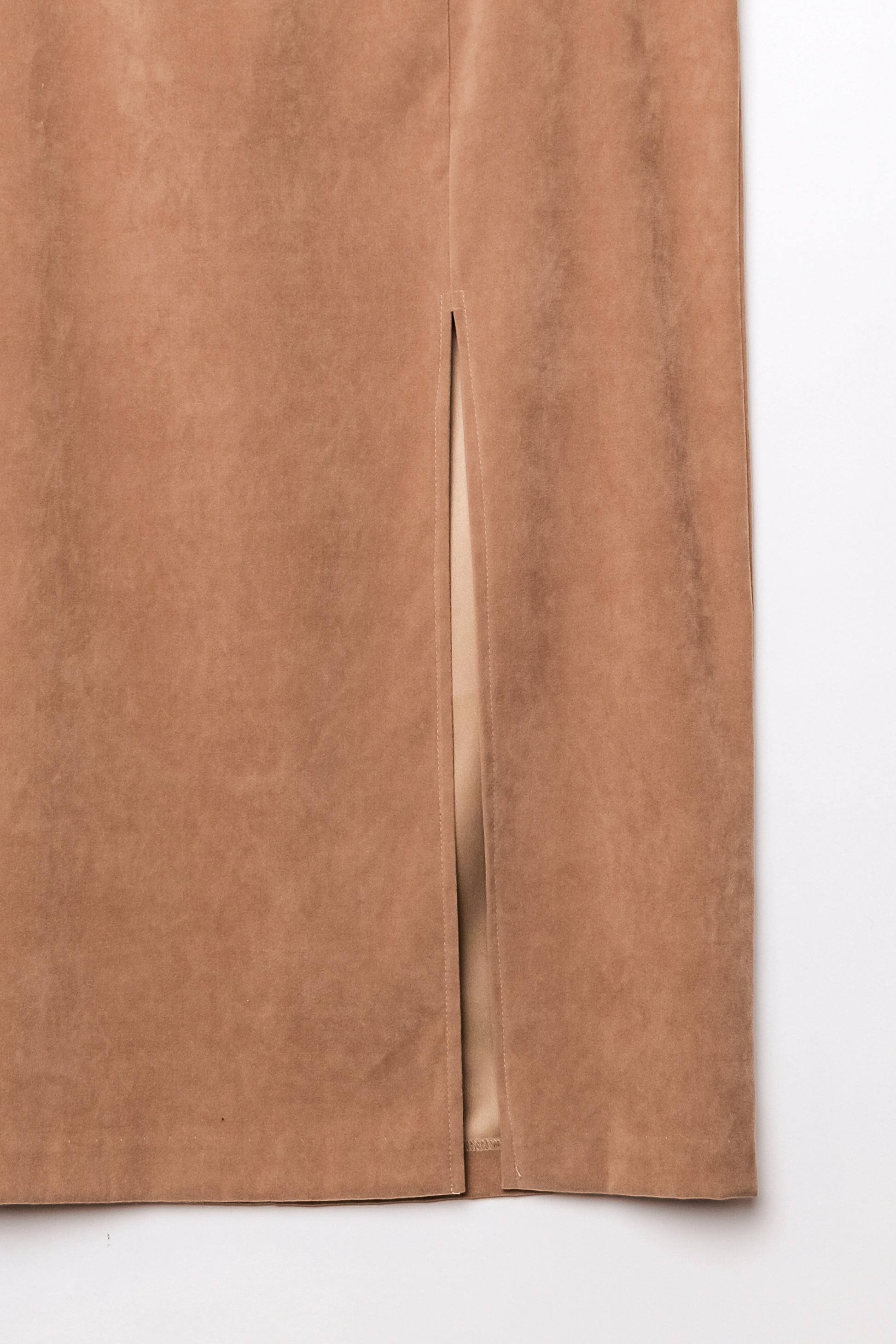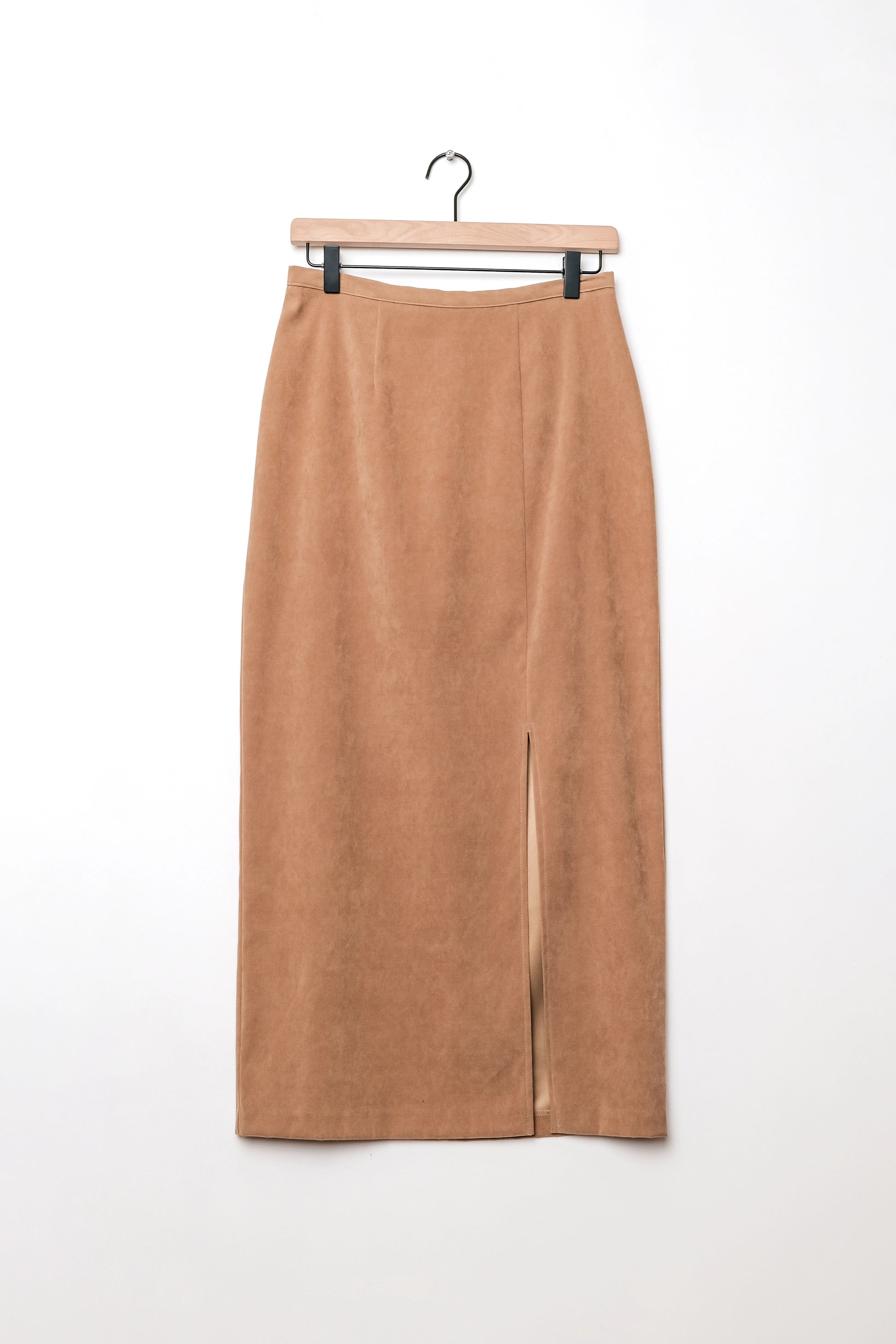 Faux suede midi skirt with slit on the side. High waisted fit. Lightweight fabric with a tiny bit of stretch, not on the waist though.