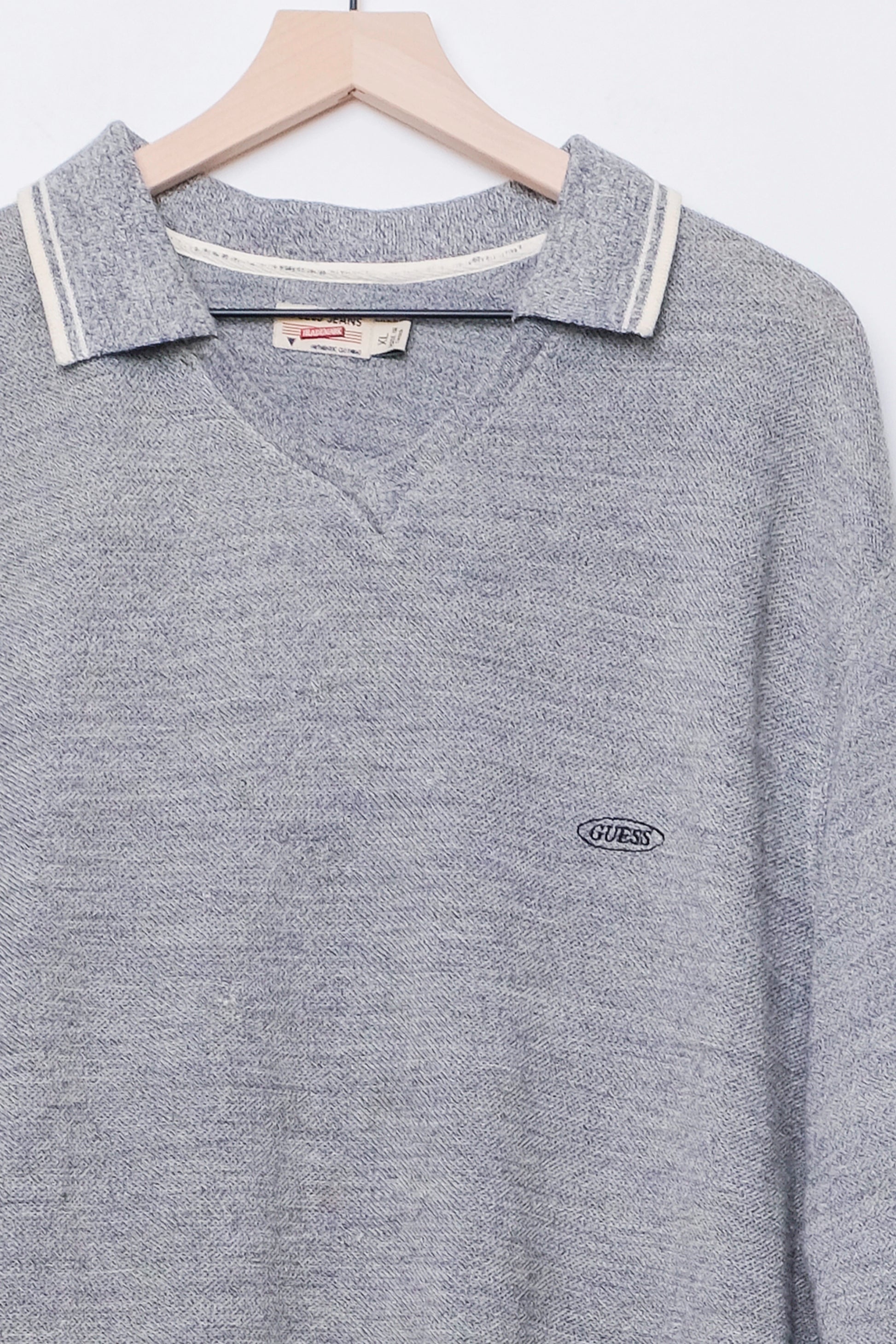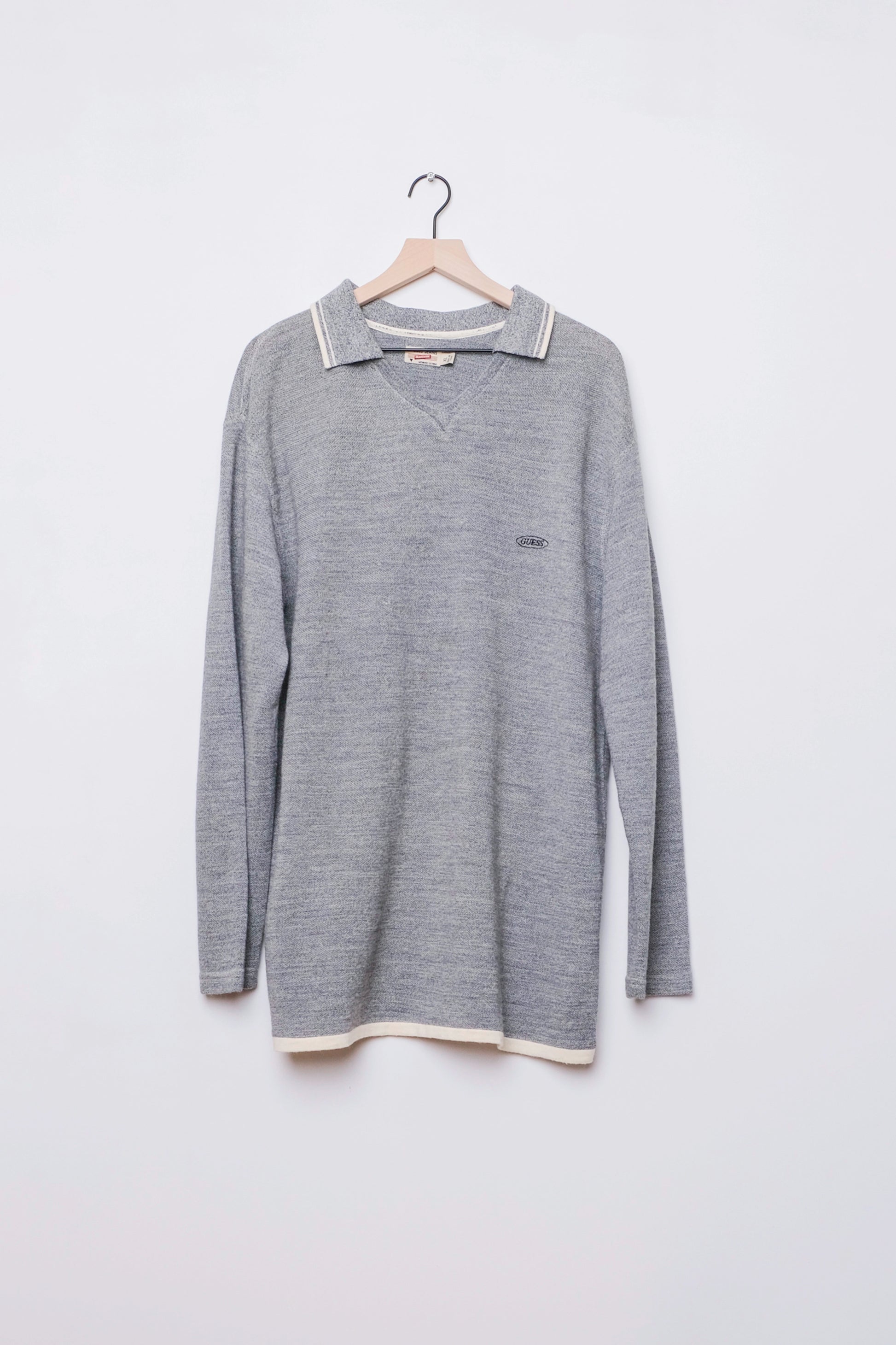 Wool blend polo sweater with white trim detail. 90's/Y2K circle Guess logo on chest. This item had small holes that were repaired (see close up photo) but they very hard to see. Can be worn as an oversized dress.