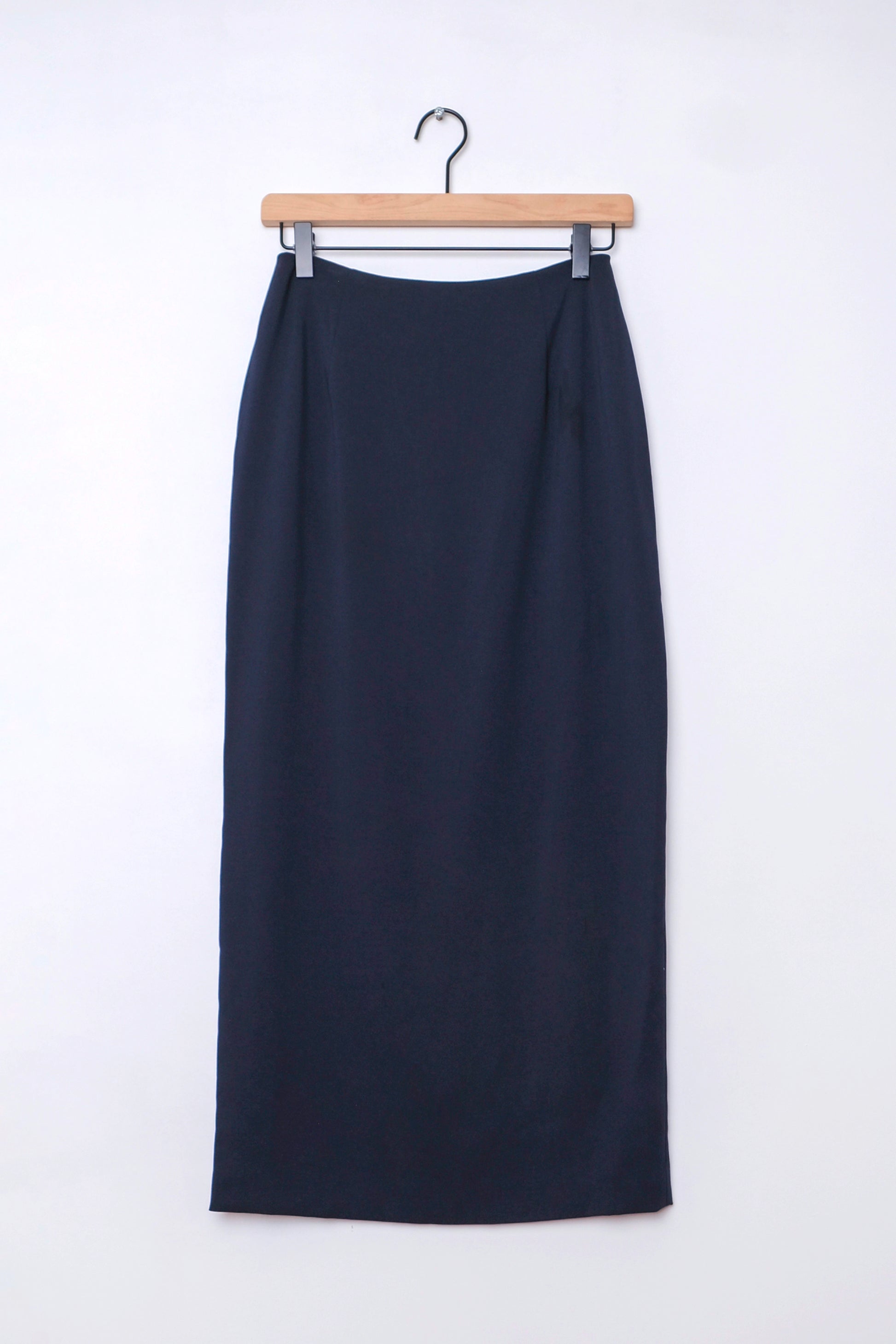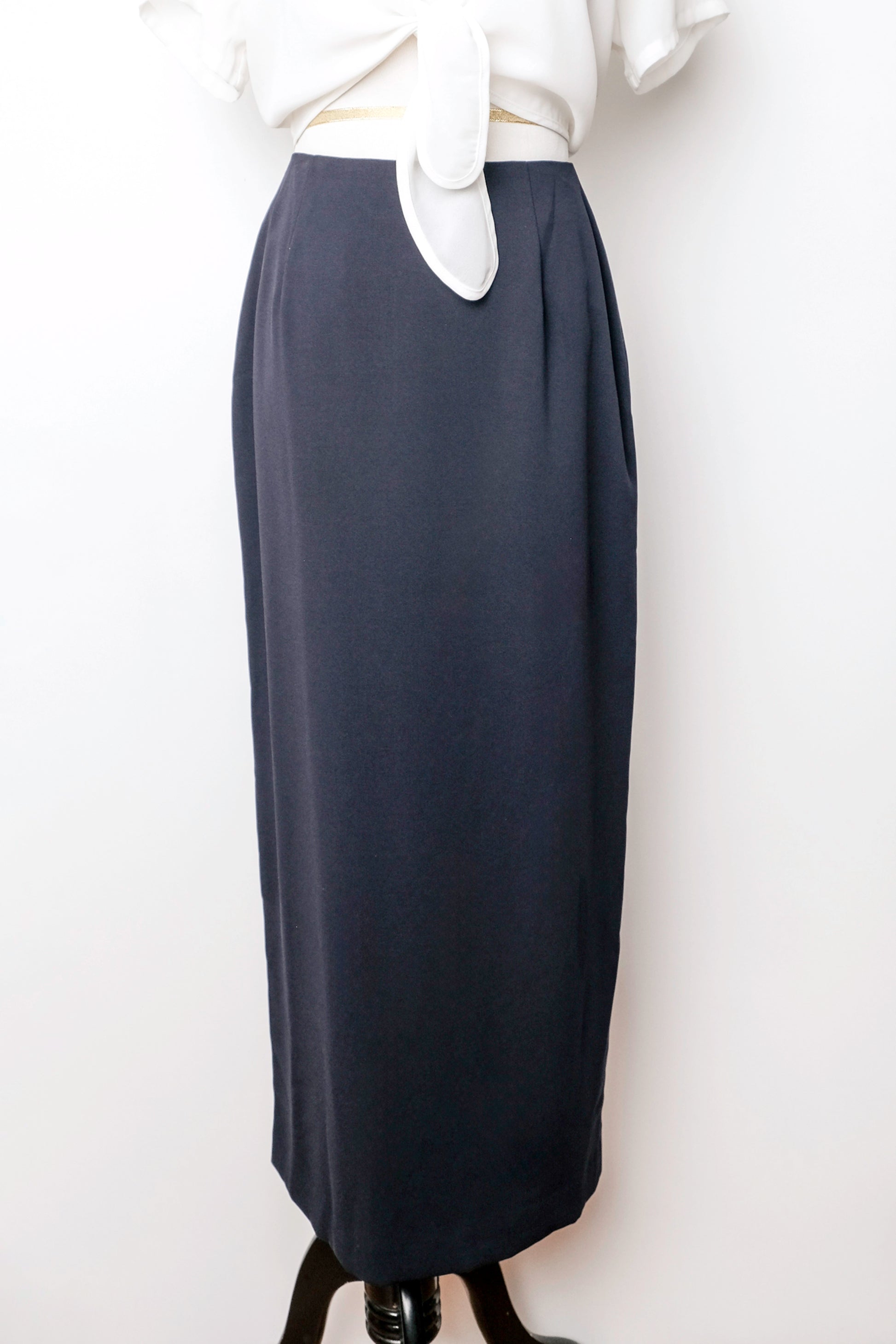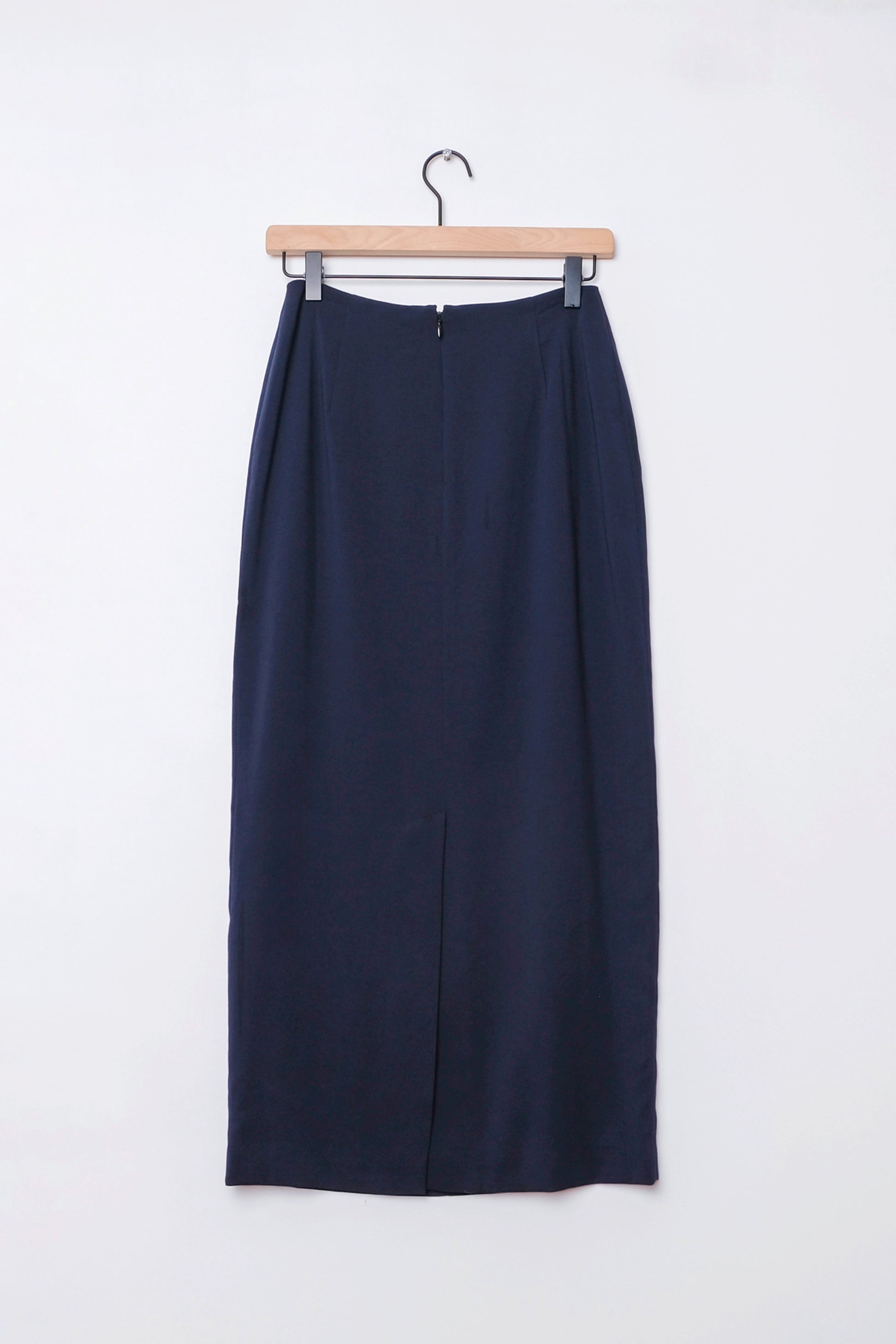 Channel your inner clean girl with this beautiful dark navy blue maxi skirt with discrete back zip closure. Back vent and two waist seams provide movement and shape to an otherwise straight cut skirt.