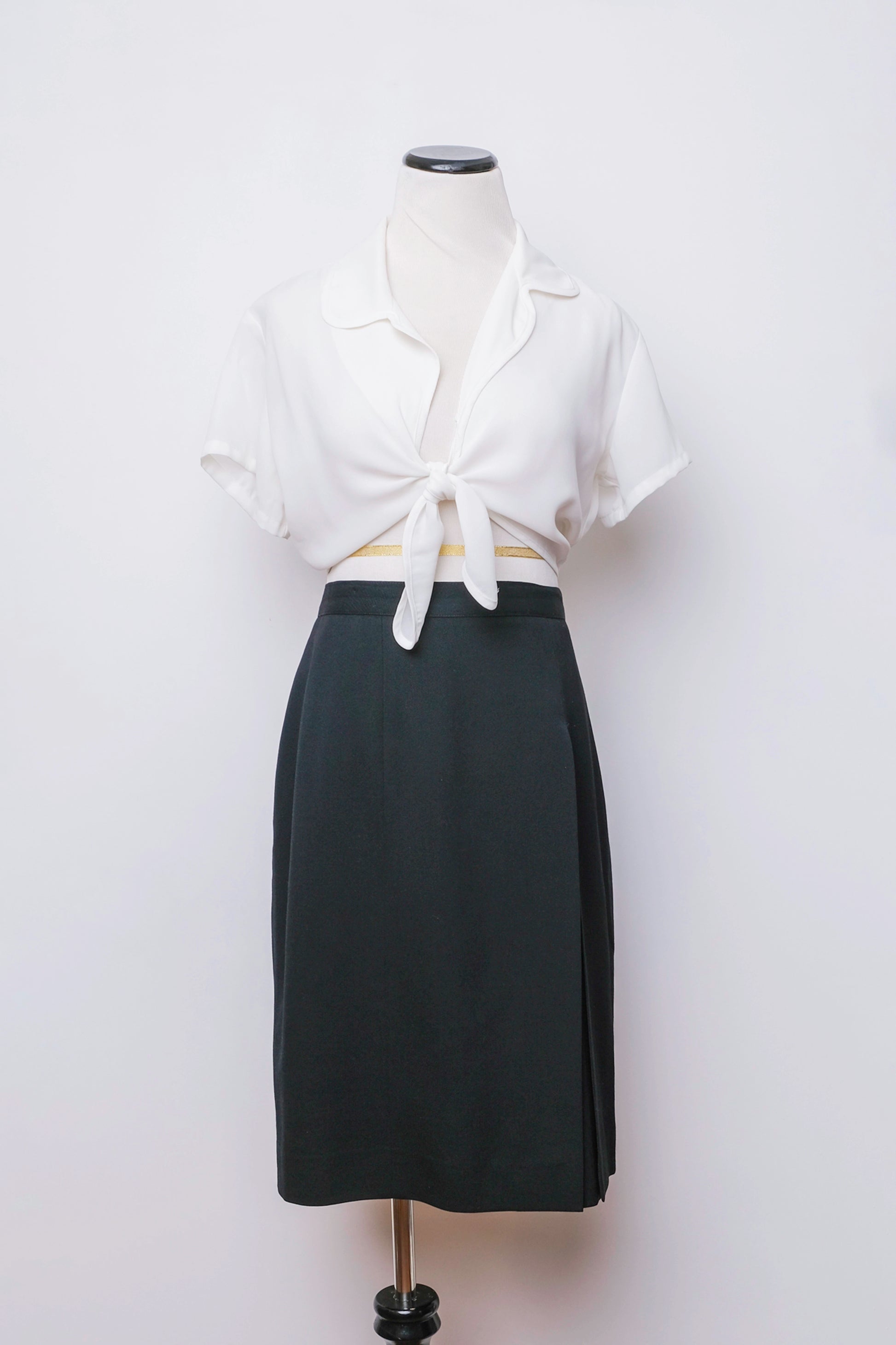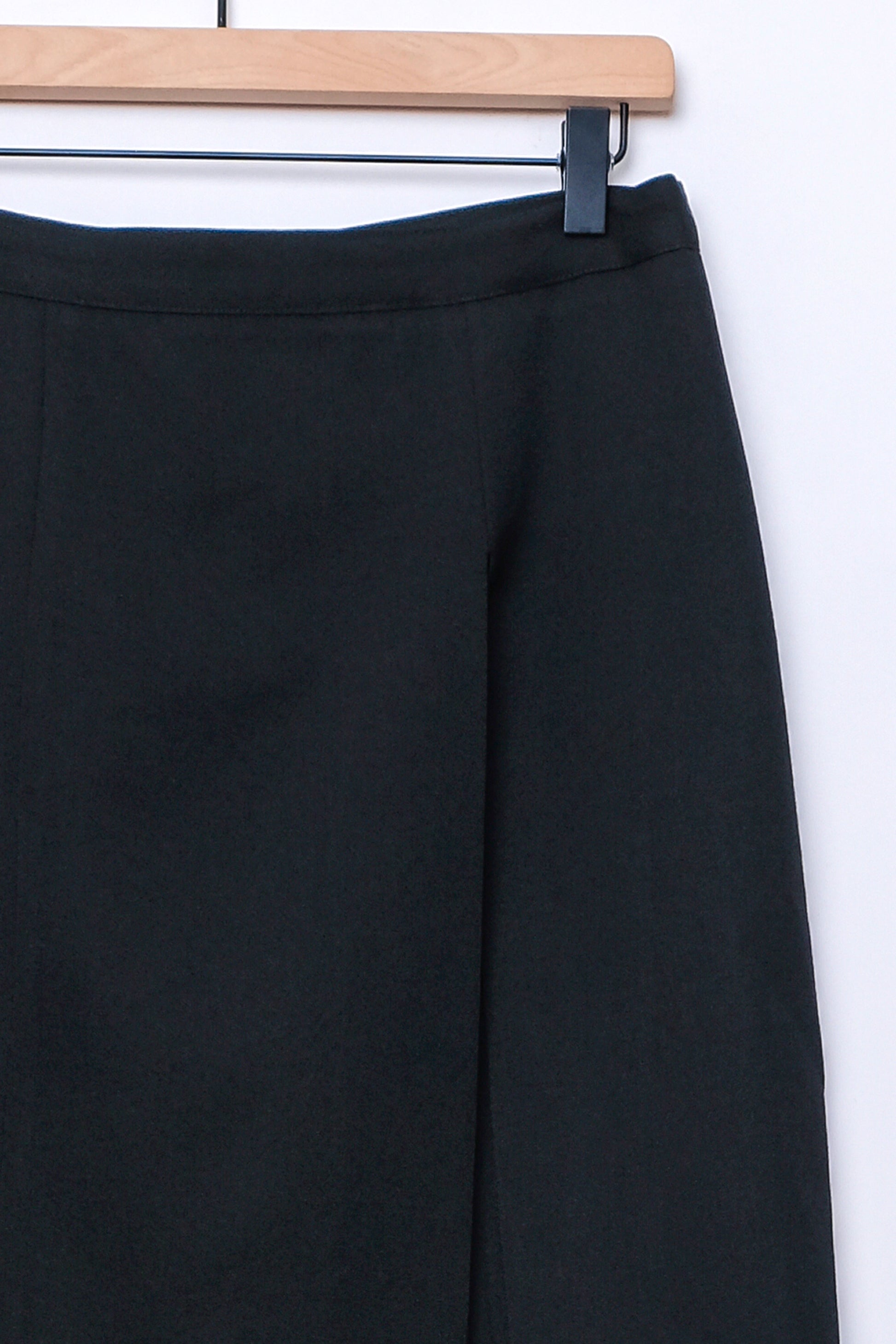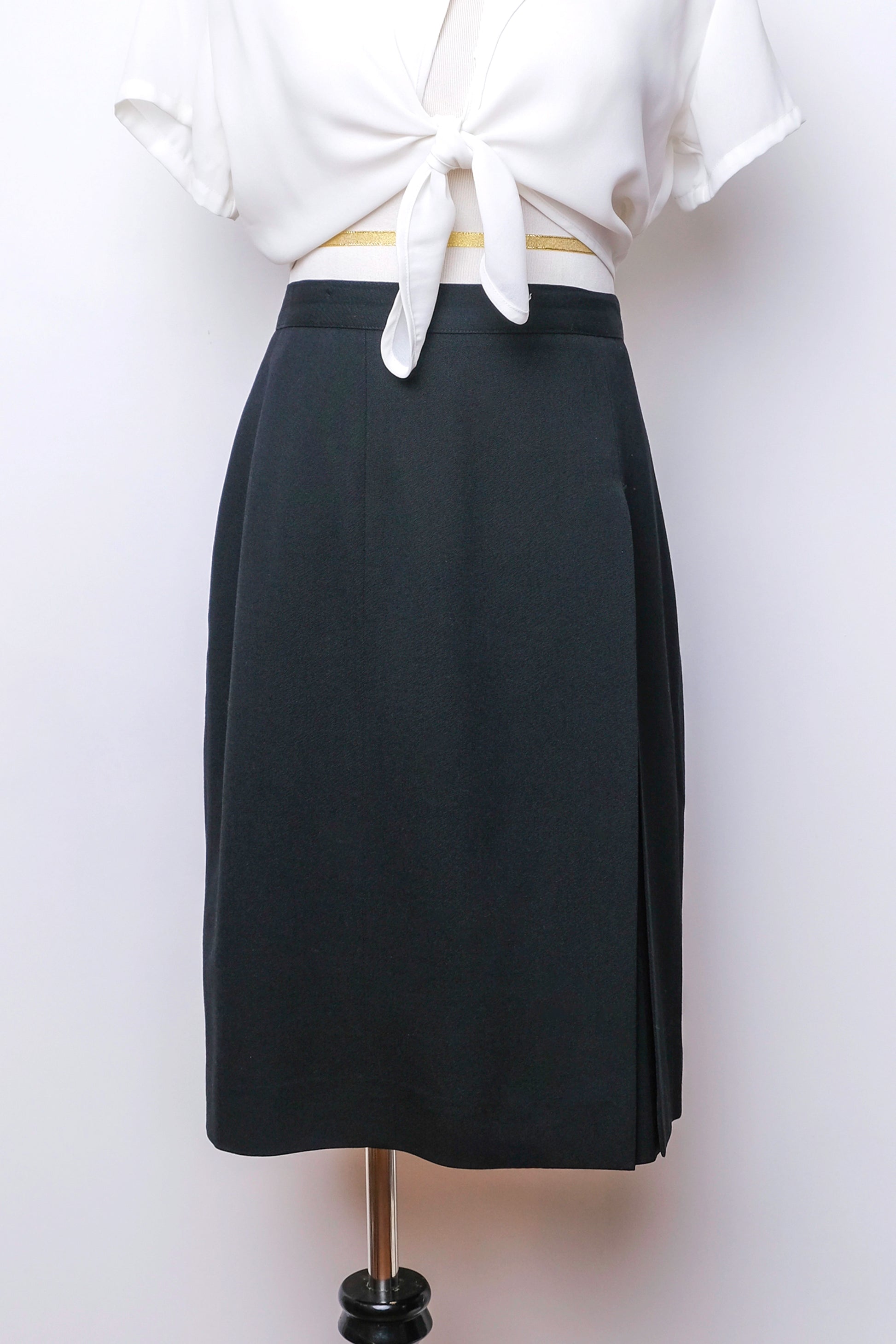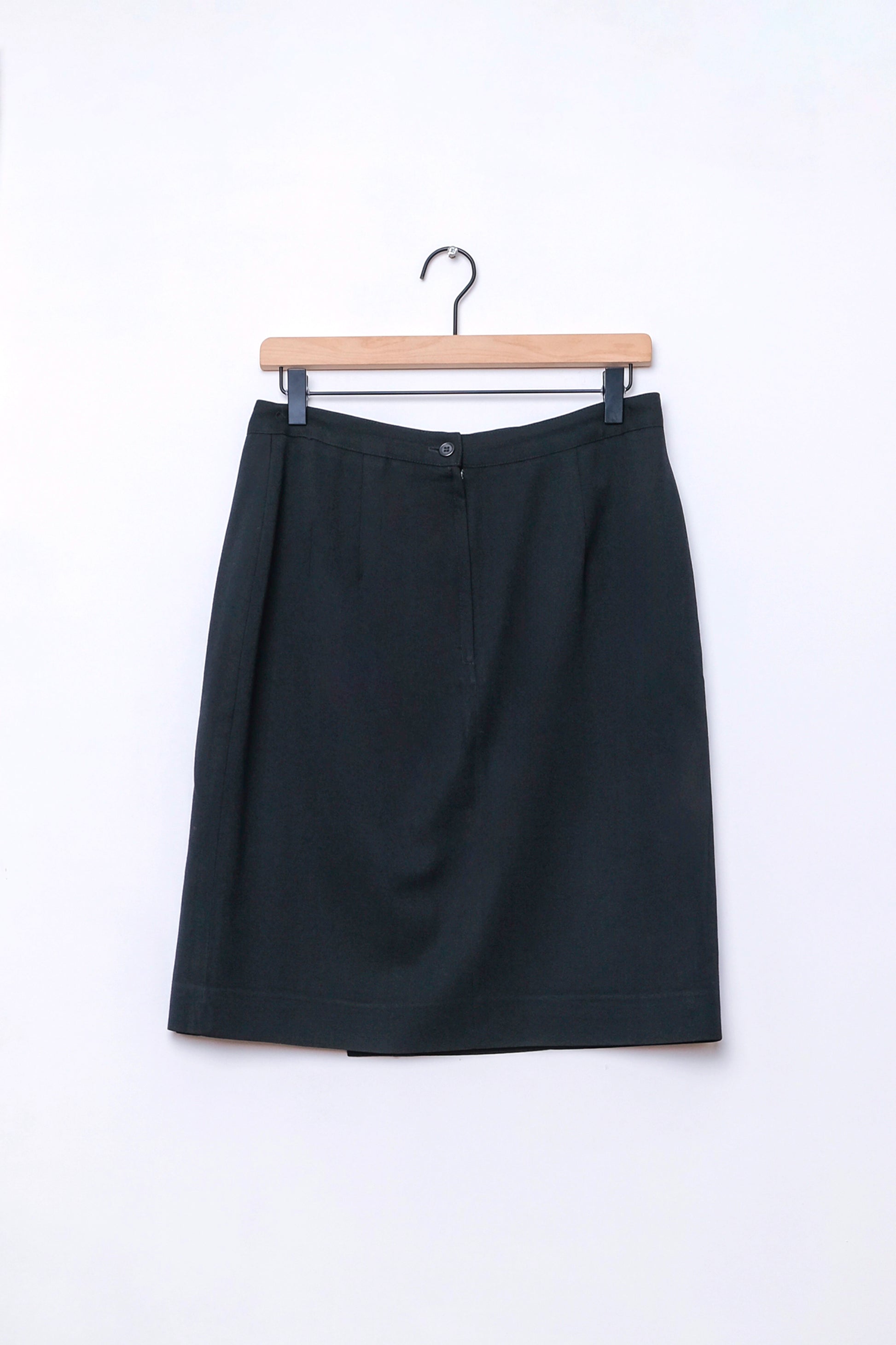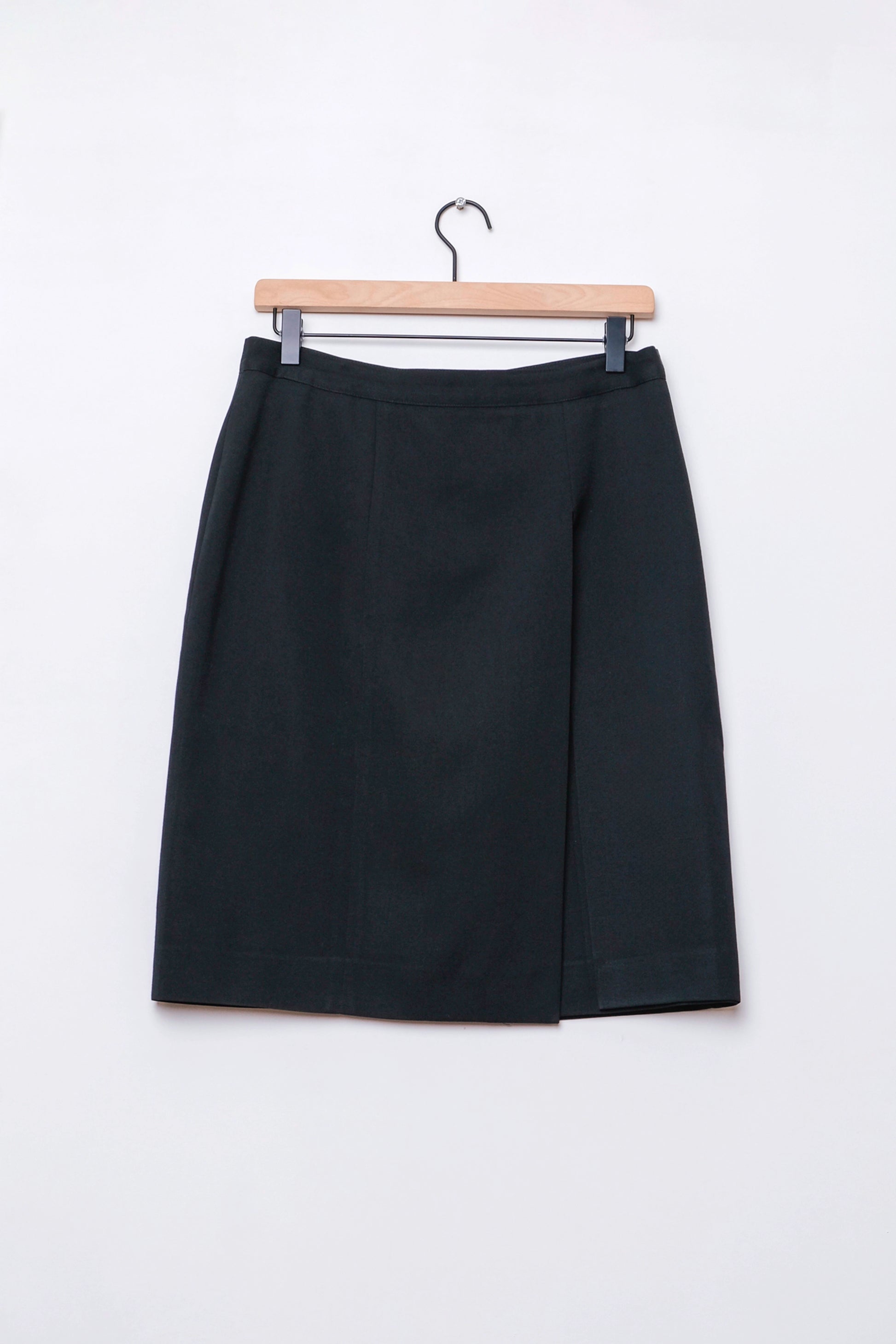 Knee length skirt wool skirt with a unique and modern front slit overlay detail. Back zip and button closure.