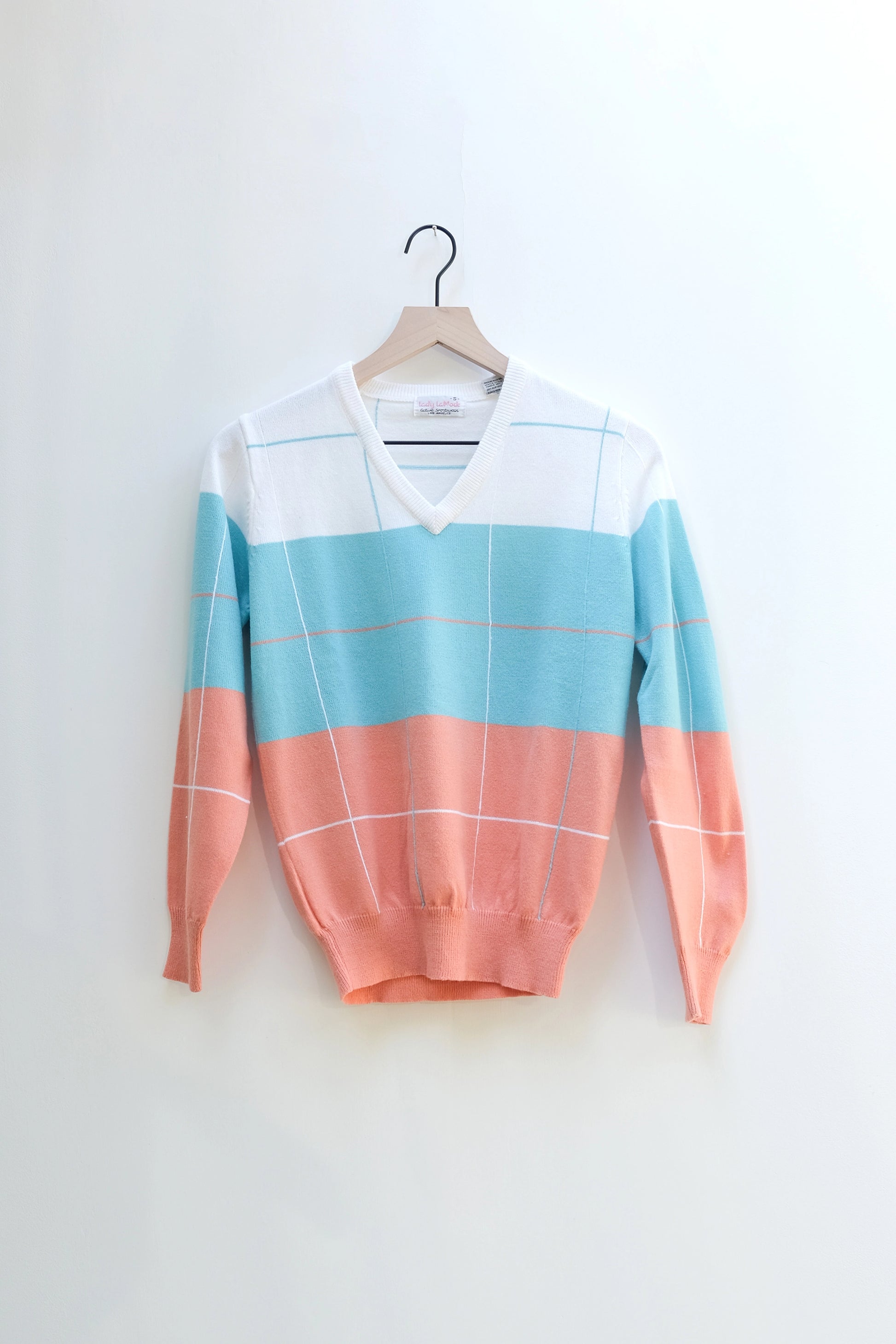 V-neck pullover golf sweater with a preppy white, aqua blue and peachy orange plaid pattern. Soft acrylic "cashmerlon" fabric.