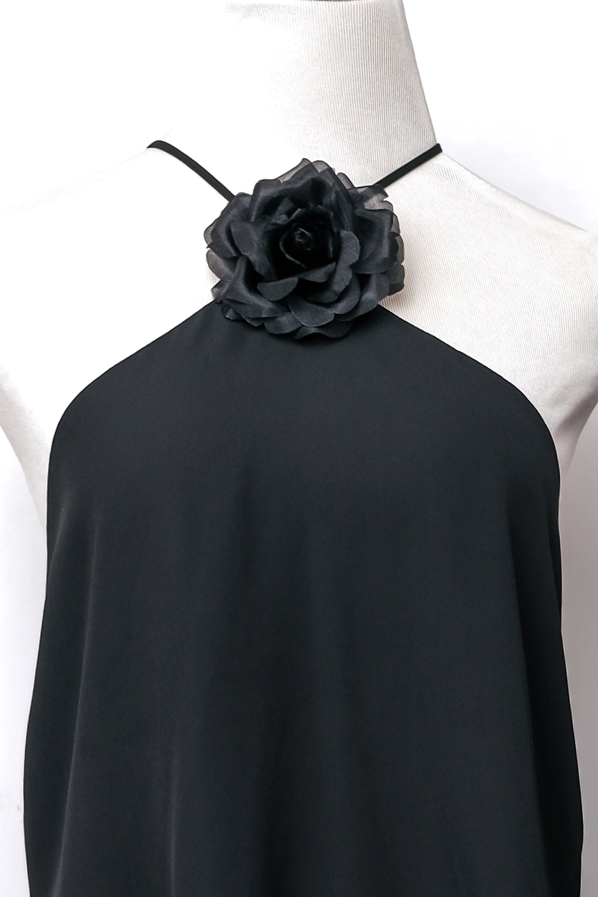 Black halter mini dress upcycled with removable handmade black silk flower from New York based atelier M&S Schmalberg. Flowy double layered a-line fit.