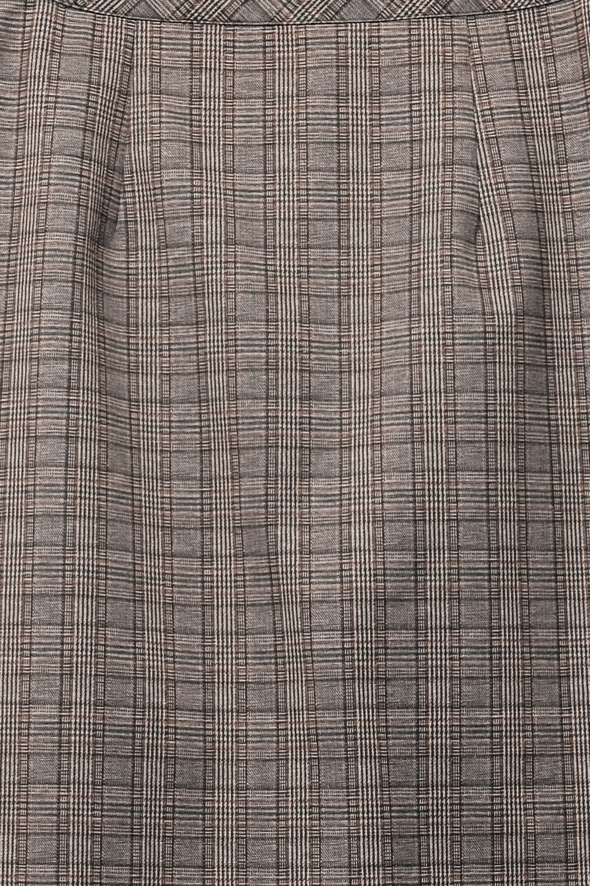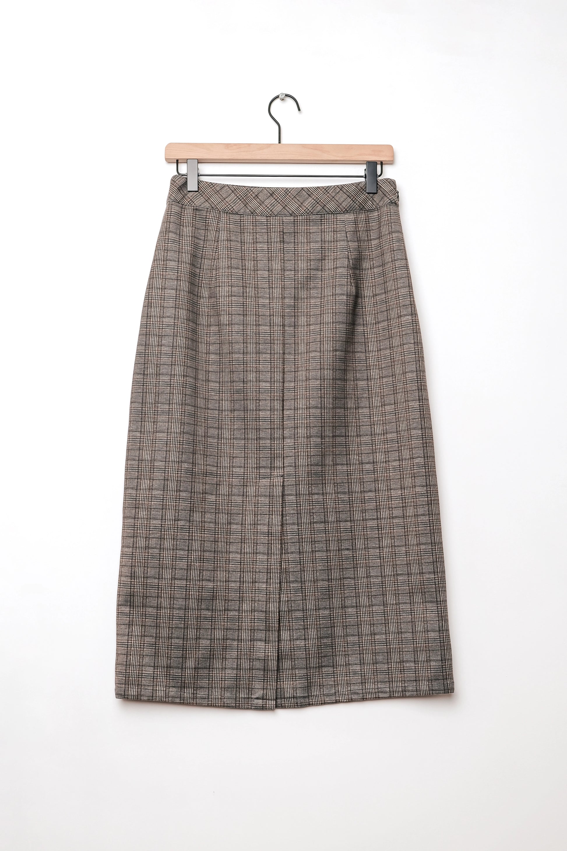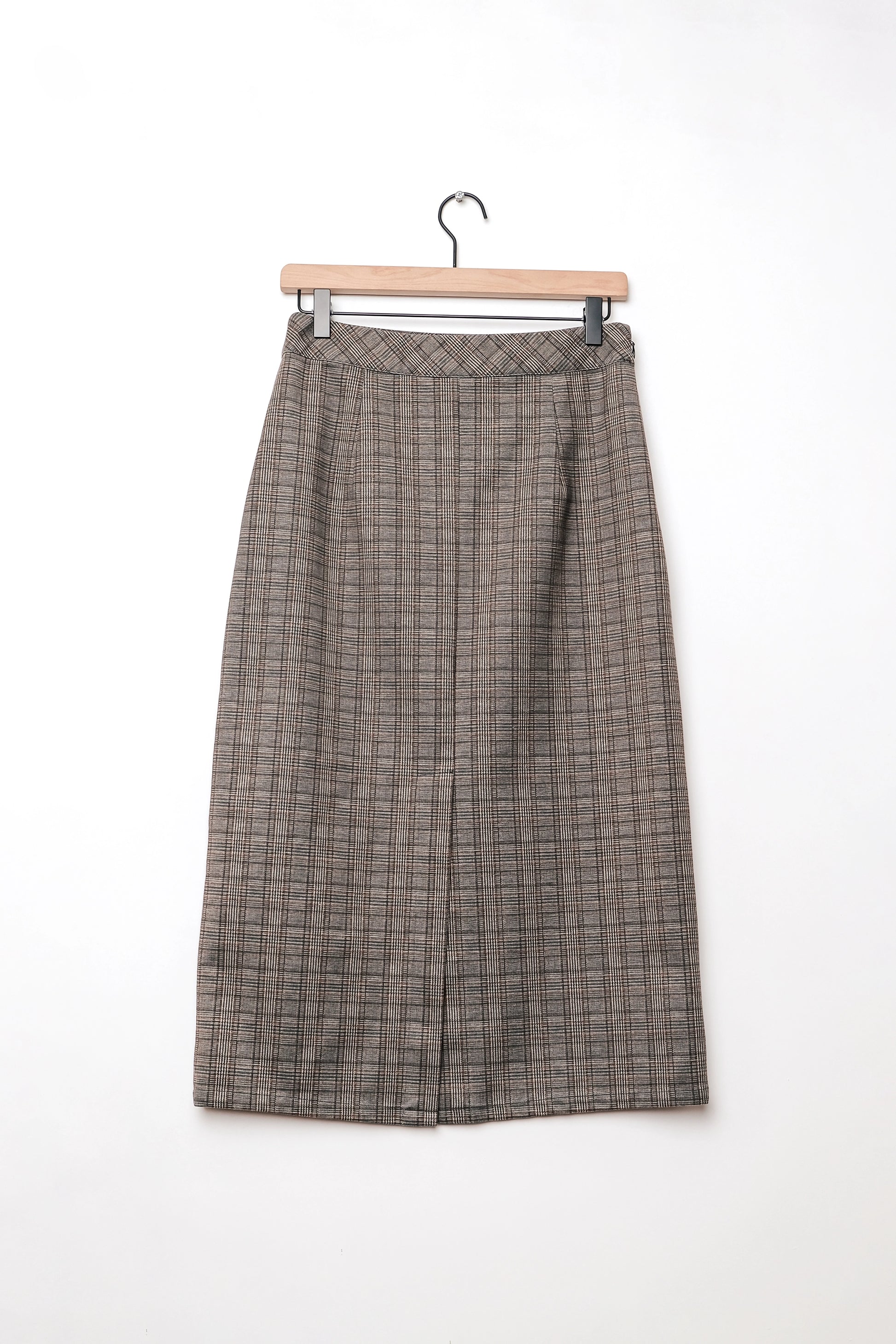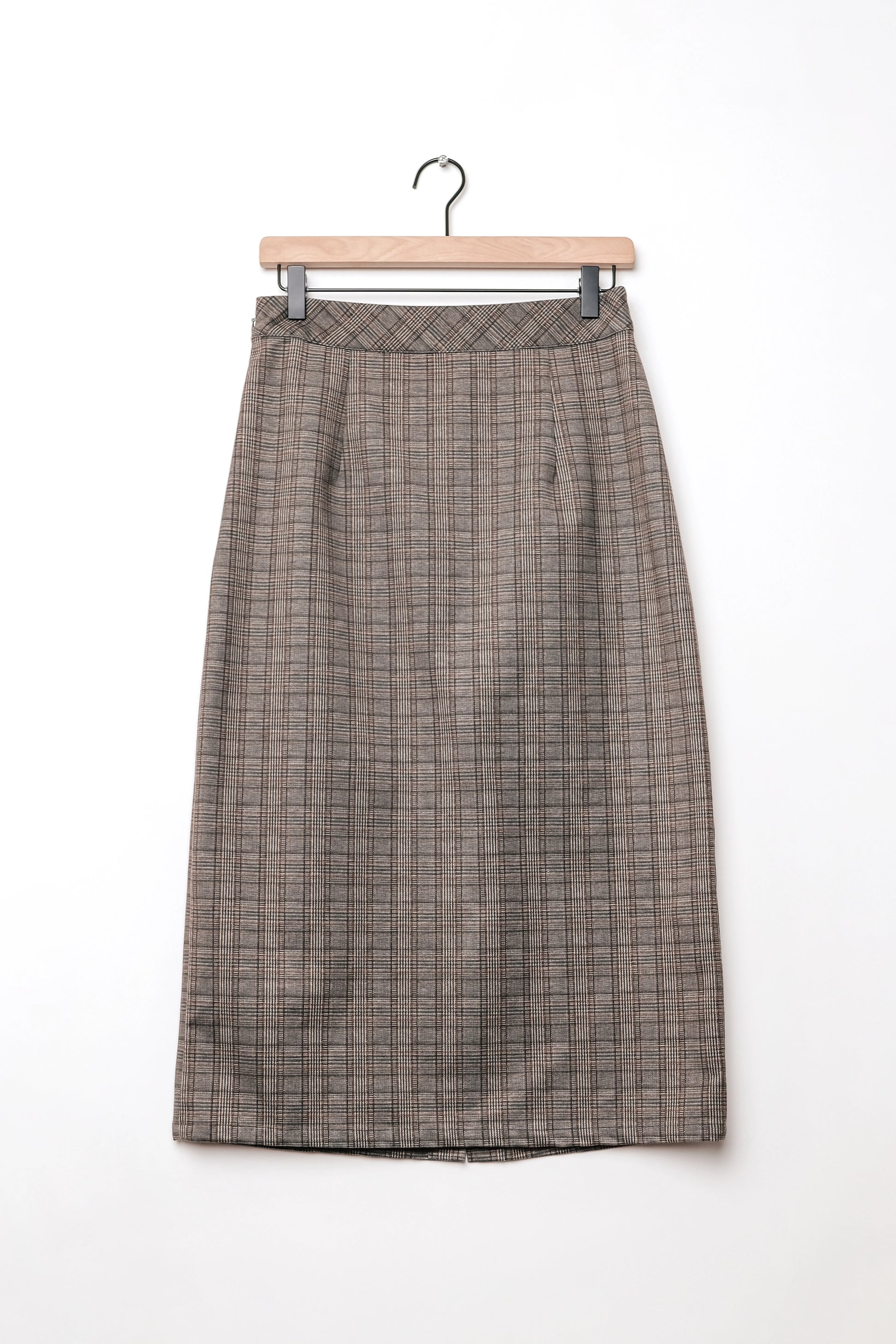 Brown plaid pencil skirt with a little bit of stretch for a comfortable fit. Hidden side zip closure.