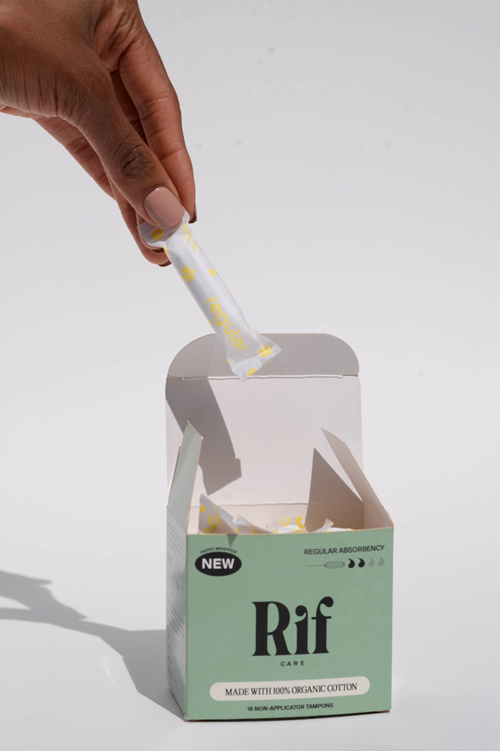 RIF's regular absorbency tampons are made with certified organic cotton and come in a plastic-free paper wrapper, making them 100% biodegradable. The organic cotton security veil helps prevent fiber shedding, ensuring they are safe for every body.