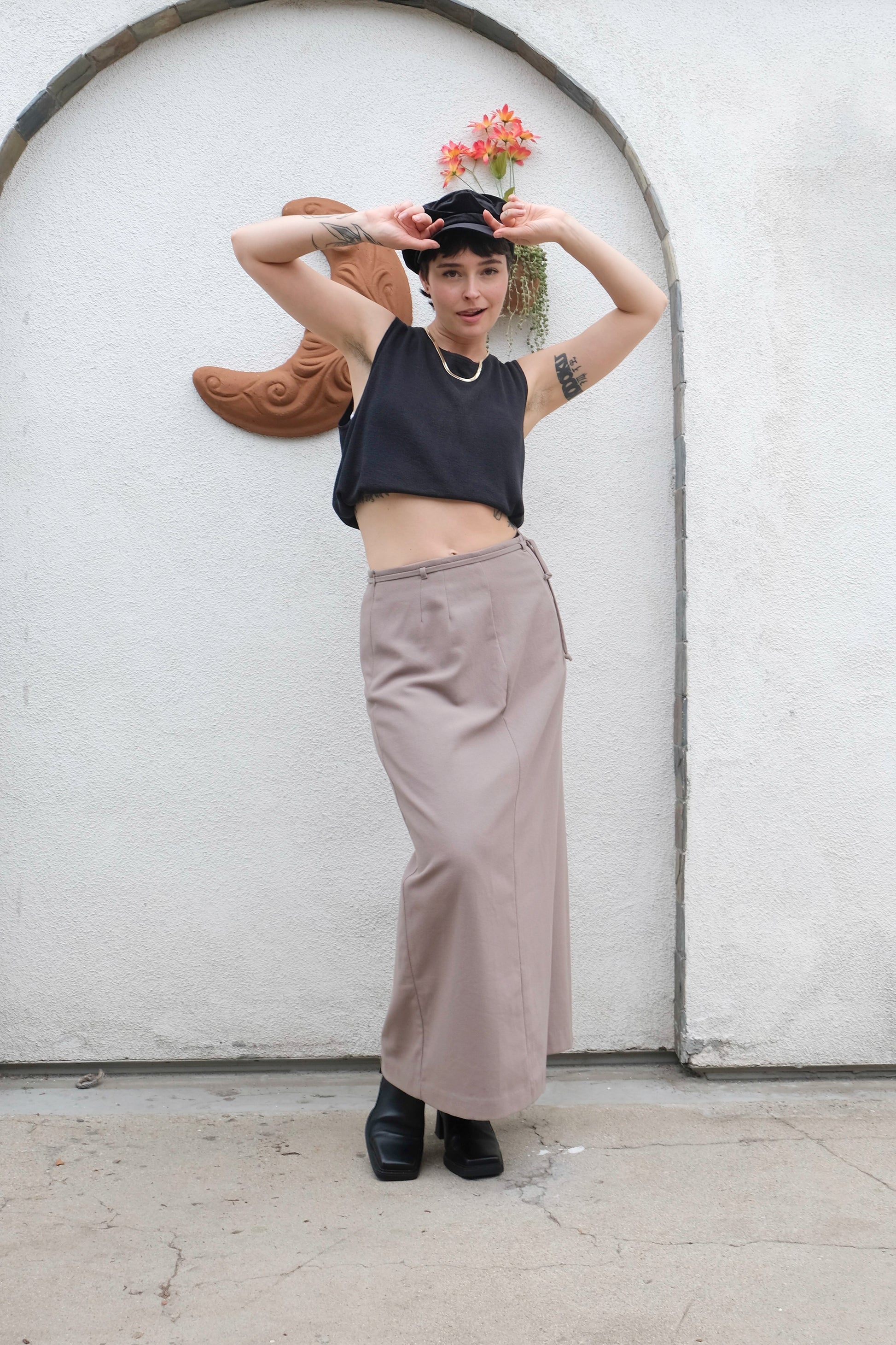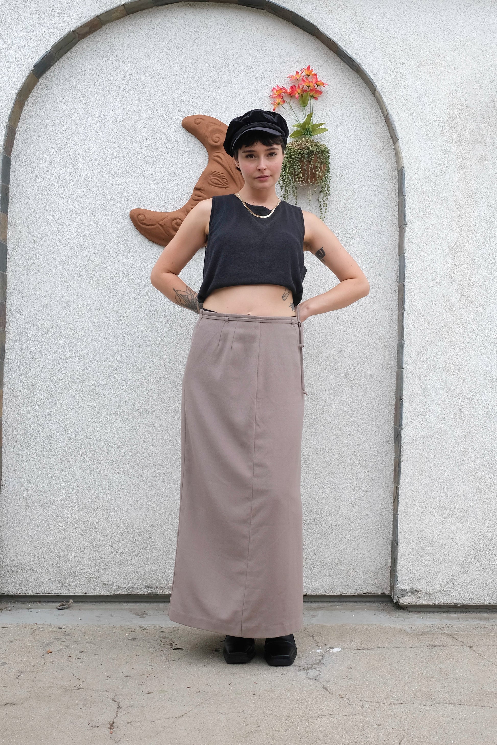 Modern/minimalist maxi skirt with a waist tie and front slit. Back zip closure. Lined.