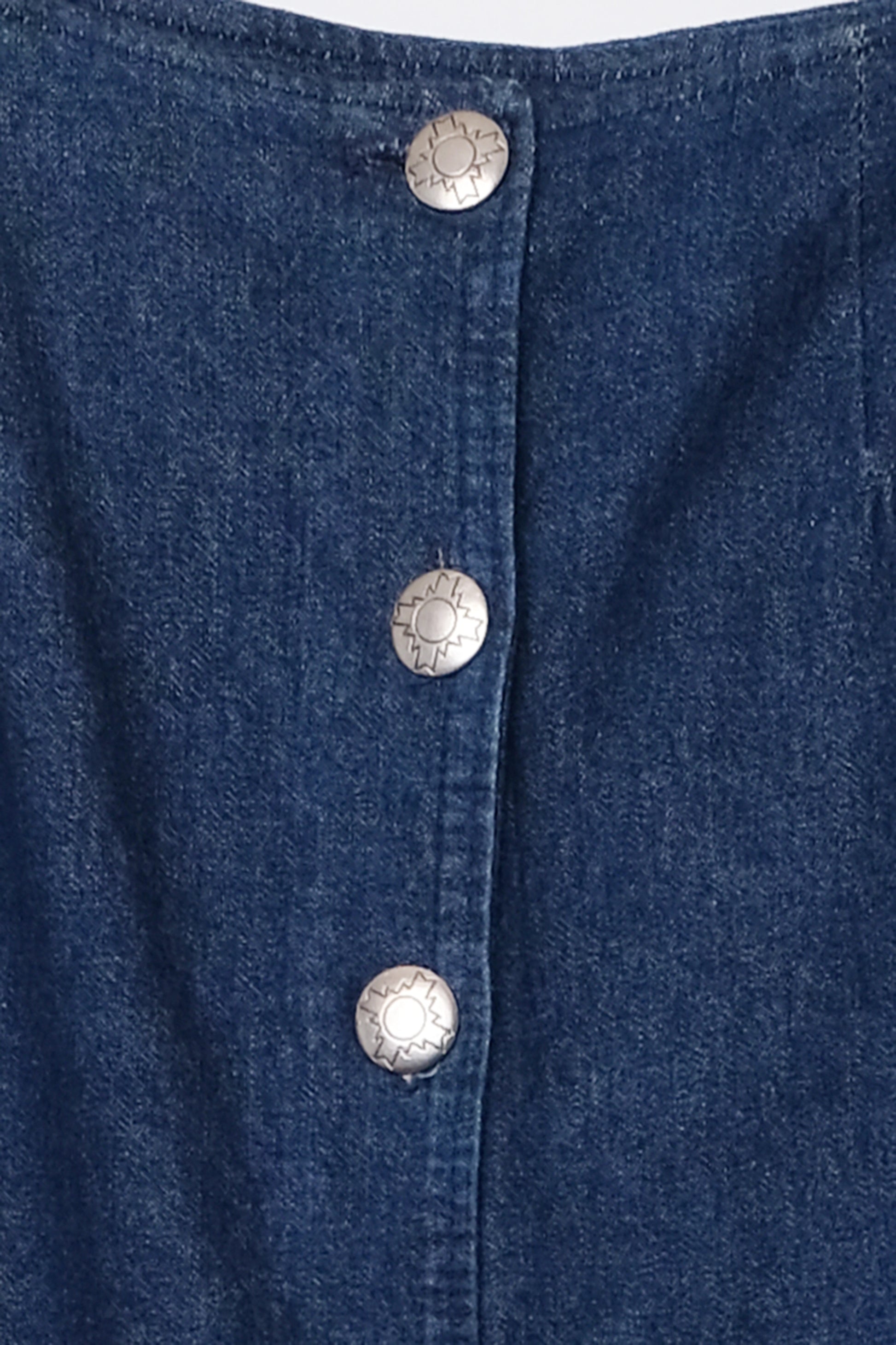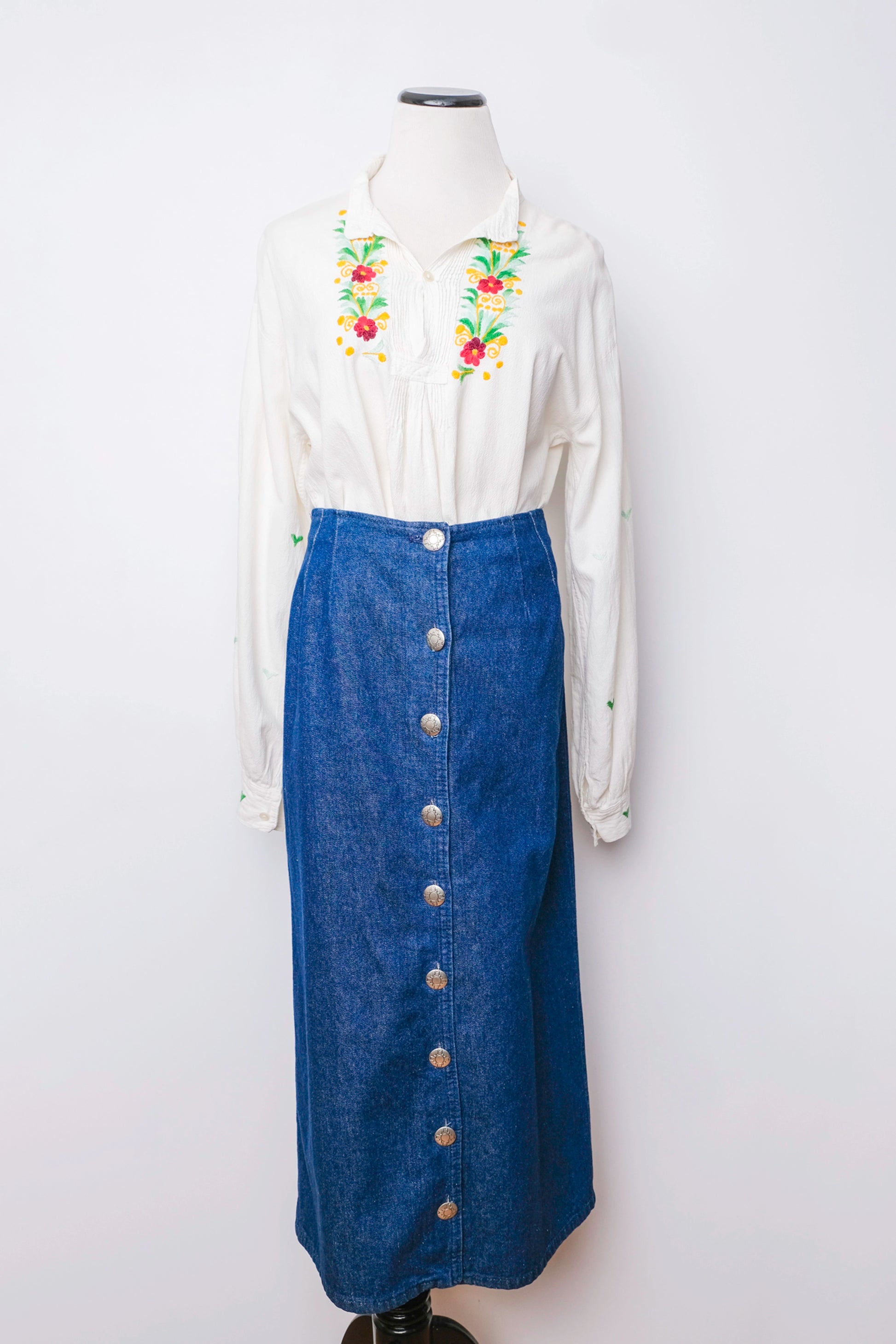 Denim pencil skirt with pleated waist detail. Unique large buttons with southwest design engraving. Slimming pencil fit. Made in USA, 90's era.