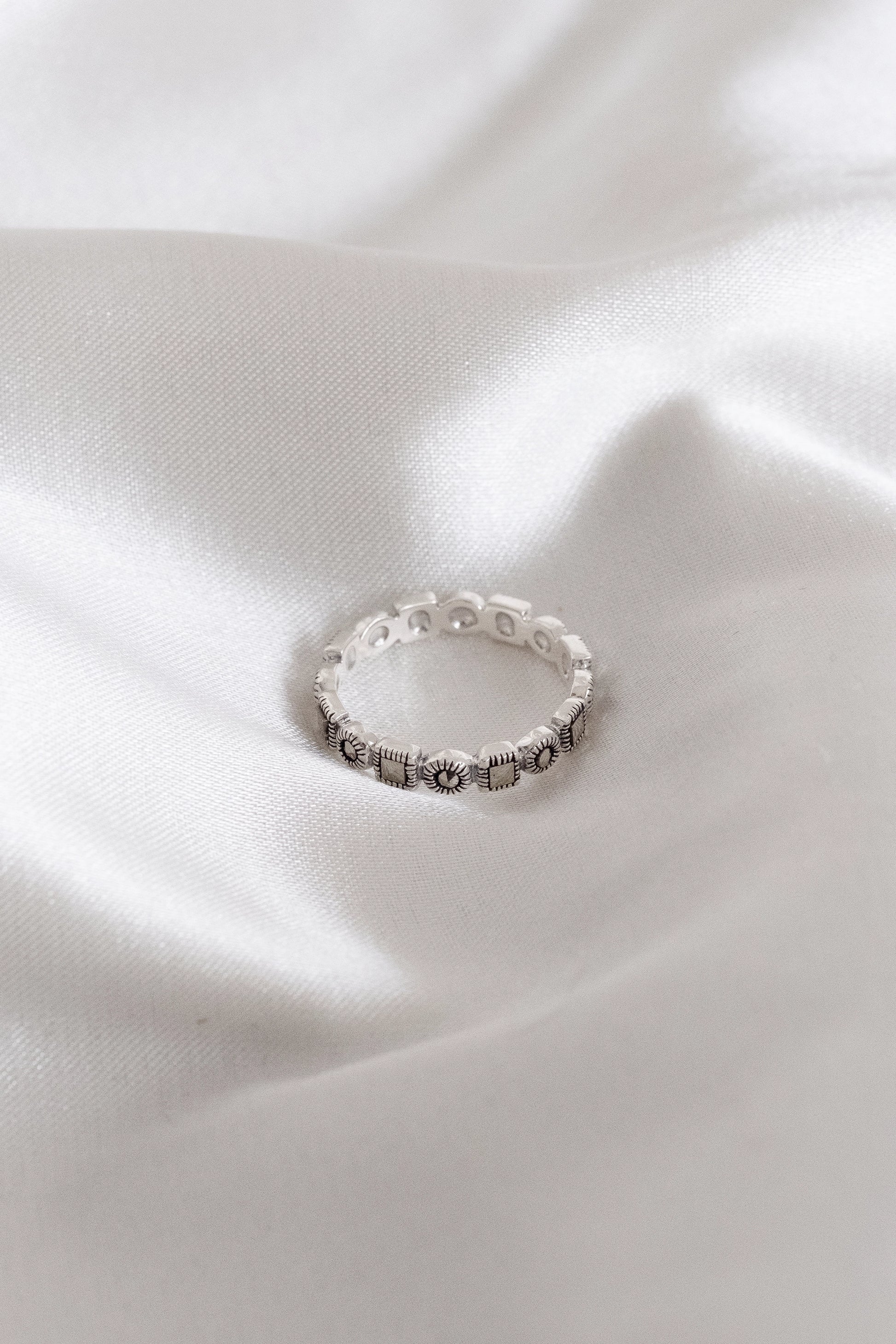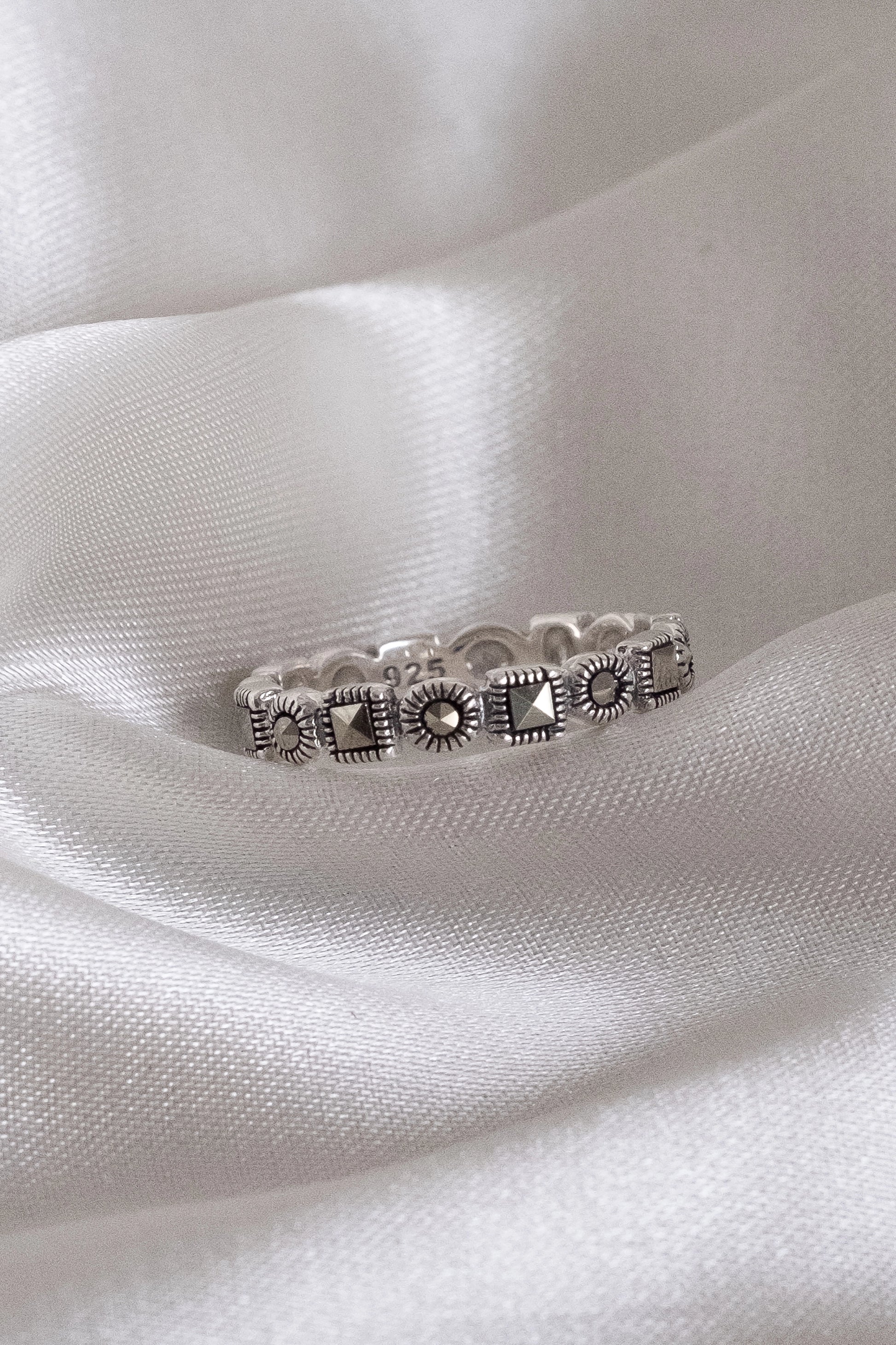 This exquisite ring is crafted from the finest sterling silver and has undergone both oxidization and polishing techniques, resulting in a stunning finish. Adorned with magnificent marcasite gems, this ring is not only a beautiful accessory but also a powerful aid in meditation. These gems promote introspection and are believed to resonate more strongly with higher, spiritual chakras.